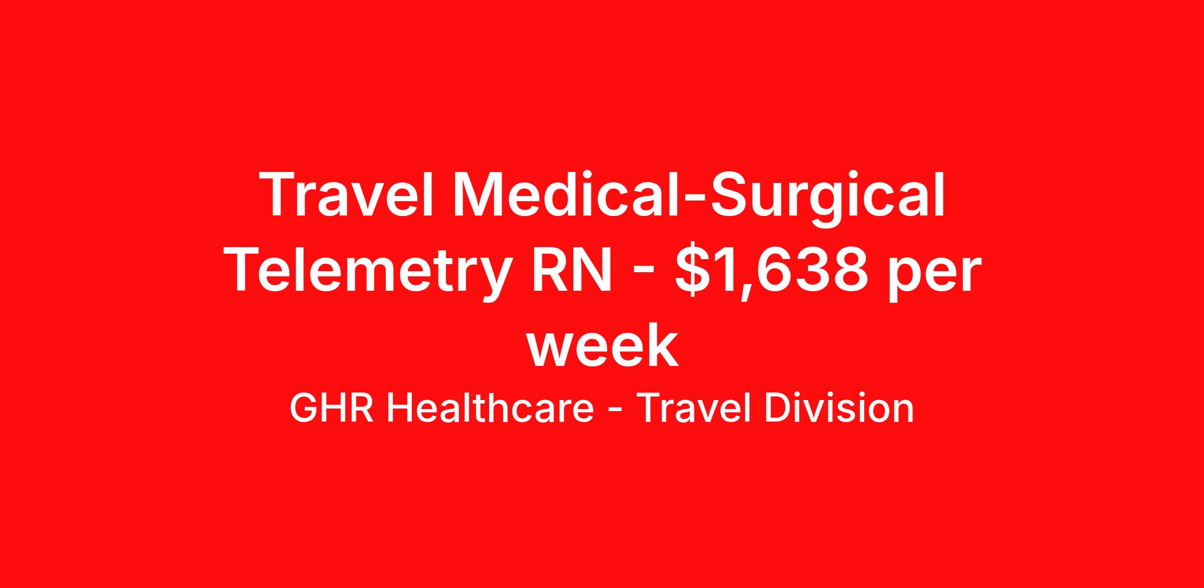 GHR Healthcare - Travel Division is seeking a travel nurse RN Med Surg for a travel nursing job in Tyler, Texas. Job Description & Requirements Specialty: Med Surg Discipline: RN Start Date: 04/20/2026 Duration: 13 weeks 36 hours per week Shift: 12 hours Employment Type: Travel GHR Healthcare - Travel Division Job ID 76178087. Pay package is based on 12 hour shifts and 36 hours per week (subject to confirmation) with tax-free stipend amount to be determined. About GHR Healthcare - Travel Division For over 30 years, GHR Healthcare has been the bridge between healthcare professionals and the facilities that need them nationwide. We're committed to uncovering your ideal fit, supported by GHR's dedication to competitive compensation, transparent communication, and a devoted team that genuinely cares about your career journey. You can trust us to stand by your side as your advocate, confidante, and partner in advancing your career. At GHR, care and consideration are at the heart of everything we do. Visit ghrhealthcare.com to learn more.
