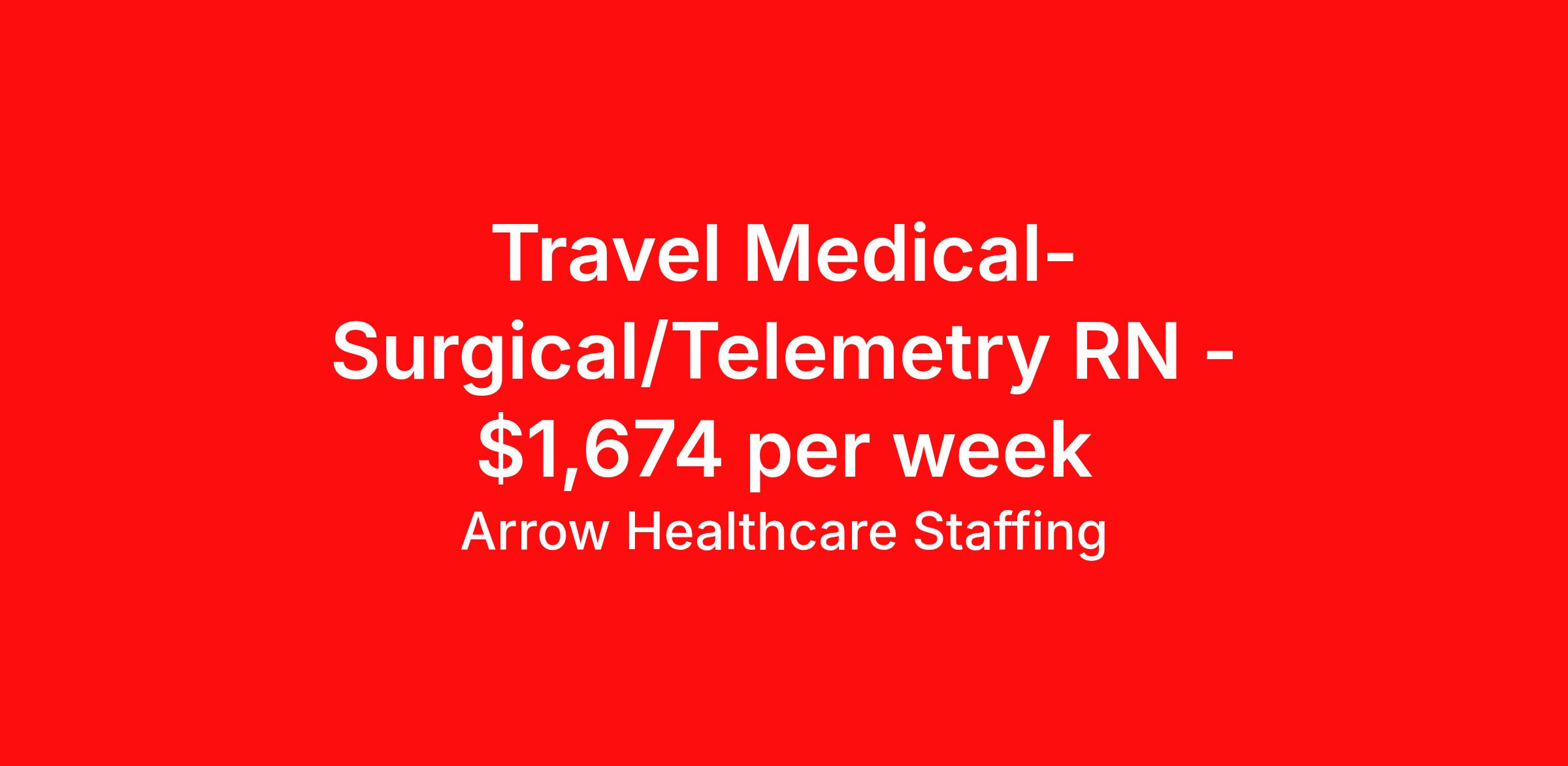 Arrow Healthcare Staffing is seeking a travel nurse RN Med Surg / Telemetry for a travel nursing job in Columbia, South Carolina. Job Description & Requirements Specialty: Med Surg / Telemetry Discipline: RN Start Date: 04/13/2026 Duration: 13 weeks 36 hours per week Shift: 12 hours, nights Employment Type: Travel Arrow Healthcare Staffing Job ID 17955721. Pay package is based on 12 hour shifts and 36.0 hours per week (subject to confirmation) with tax-free stipend amount to be determined. Posted job title: RN - MedSurg / Tele RN MedSurg / Tele About Arrow Healthcare Staffing Arrow Healthcare Staffing is a Midwest based travel nursing and allied health recruiting firm. We specialize in local/ travel nursing, medical laboratory, pharmacy, radiology/imaging, therapy, and executive/leadership recruitment. We offer direct hospital contracts and all of the top benefits in the marketplace today. Benefits Medical benefits Vision benefits Weekly pay Benefits start day 1 Holiday Pay 401k retirement plan Dental benefits License and certification reimbursement Guaranteed Hours Continuing Education Cancelation protection Mileage reimbursement Referral bonus