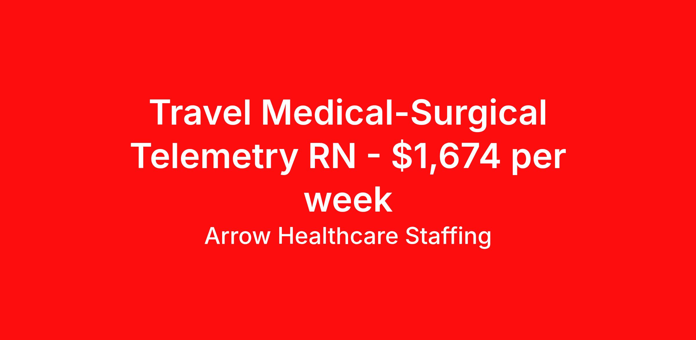 Arrow Healthcare Staffing is seeking a travel nurse RN Med Surg / Telemetry for a travel nursing job in Orangeburg, South Carolina. Job Description & Requirements Specialty: Med Surg / Telemetry Discipline: RN Start Date: 04/21/2026 Duration: 13 weeks 36 hours per week Shift: 12 hours, nights Employment Type: Travel Arrow Healthcare Staffing Job ID 17603730. Pay package is based on 12 hour shifts and 36.0 hours per week (subject to confirmation) with tax-free stipend amount to be determined. Posted job title: RN - MedSurg / Tele RN MedSurg / Tele About Arrow Healthcare Staffing Arrow Healthcare Staffing is a Midwest based travel nursing and allied health recruiting firm. We specialize in local/ travel nursing, medical laboratory, pharmacy, radiology/imaging, therapy, and executive/leadership recruitment. We offer direct hospital contracts and all of the top benefits in the marketplace today. Benefits Medical benefits Vision benefits Weekly pay Benefits start day 1 Holiday Pay 401k retirement plan Dental benefits License and certification reimbursement Guaranteed Hours Continuing Education Cancelation protection Mileage reimbursement Referral bonus