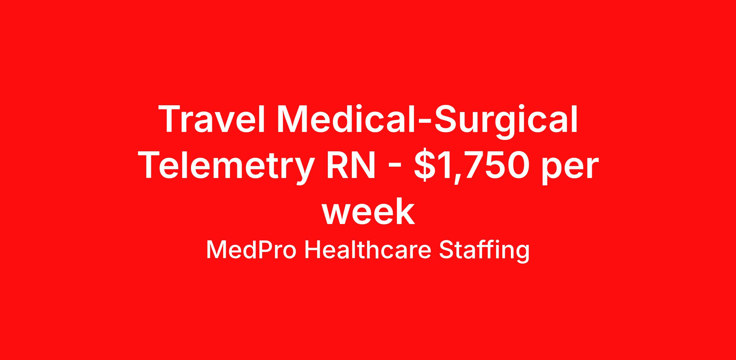 MedPro Healthcare Staffing is seeking a travel nurse RN Med Surg / Telemetry for a travel nursing job in Orangeburg, South Carolina. Job Description & Requirements Specialty: Med Surg / Telemetry Discipline: RN Start Date: 04/21/2026 Duration: 13 weeks 36 hours per week Shift: 12 hours, nights Employment Type: Travel MedPro Healthcare Staffing , a Joint Commission-certified staffing agency, is seeking a quality Med-Surg registered nurse (RN) for a travel assignment with one of our top healthcare clients. Requirements Active RN License Degree from accredited nursing program BLS Certifications Eighteen months of recent experience in an Acute Care Med/Surg setting Other requirements to be determined by our client facility Benefits Weekly pay and direct deposit Full coverage of all credentialing fees Private housing or housing allowance Group Health insurance for you and your family Company-paid life and disability insurance Travel reimbursement 401(k) matching Unlimited Referral Bonuses up to $1,000 Duties Responsibilities Med-Surg Nurses (RN) provide care for primarily adult patients before and after surgical procedures; they also attend to those who are being treated with pharmaceuticals to manage illness. Due to the broad range of medical conditions Med/Surg Nurses will encounter, they must be well-versed in a large variety of health conditions. Complete assignments made by physicians. Provide routine treatment and post-surgical care. Assess changes in patient's health status and perform various treatments. Administer medication. Meticulous documentation as to medication and treatment administration to ensure continuity of care between nursing staff, physicians and other treatment team members. About Agency MedPro Healthcare Staffing is a Joint Commission certified provider of contract staffing services. Since 1983, we have placed nursing and allied travelers in top healthcare facilities nationwide. Join us today for your very own MedPro Experience®. If qualified and interested, please call for immediate consideration. MedPro Staffing is an Equal Opportunity Employer. All applicants will be considered for employment without attention to race, color, religion, national origin, age, sex, disability, marital status or veteran status. Key Words: Registered Nurse, RN, Medical-Surgical, Travel Nurse, Contract Nurse, Agency Nurse, Agency RN, RN-MS, RN- Medical Surgical, Travel RN, Contract, Nursing, RN Med-Surg, Travel Nursing *Weekly payment estimates are intended for informational purposes only and include a gross estimate of hourly wages and reimbursements for meal, incidental, and housing expenses. Your recruiter will confirm your eligibility and provide additional details. MedPro Job ID a0Fcx00000DFxOTEA1. Pay package is based on 12 hour shifts and 36 hours per week (subject to confirmation) with tax-free stipend amount to be determined. Posted job title: Med-Surg/Telemetry Registered Nurse Nursing: Med Surg/Tele. About MedPro Healthcare Staffing At MedPro Healthcare Staffing , we believe no one cares more for caregivers than we do. Our mission is simple: you focus on your patients, and we’ll take care of the rest. As a Joint Commission-certified leader in temporary and contract healthcare staffing since 1983, MedPro has proudly connected nursing and allied travelers with top healthcare facilities across the nation. With thousands of job opportunities available nationwide, we make it easy to find assignments that align with your goals and lifestyle. Our on-staff clinical support team—alongside a compassionate group of experienced recruiters—provides hands-on guidance every step of the way. From Day 1 medical benefits and a 401(k) plan to personalized career support, we’re committed to ensuring every professional we serve feels valued, cared for, and empowered to succeed. Guided by a CEO who is a Registered Nurse, MedPro is built on a foundation of clinical insight and genuine compassion for the caregiving community. Through The MedPro Experience® , we deliver travel assignments that are rewarding, memorable, and designed to help you DREAM big, EXPLORE often, and ACHIEVE greatness. Benefits Day 1 medical, dental, and vision benefits for you and your family Weekly pay and direct deposit Unlimited Referral Bonuses starting at $500 On Staff Clinical Support Team Access to nationwide travel assignments MPX Mobile app -24/7 real-time access to jobs, credentials, assignment details, and more Full coverage of all credentialing fees Private housing or housing allowance Tax Free Per Diems, Housing Stipends and Travel Reimbursements Company-paid life and disability insurance Travel reimbursement 401(k) matching Benefits Weekly pay Referral bonus Employee assistance programs