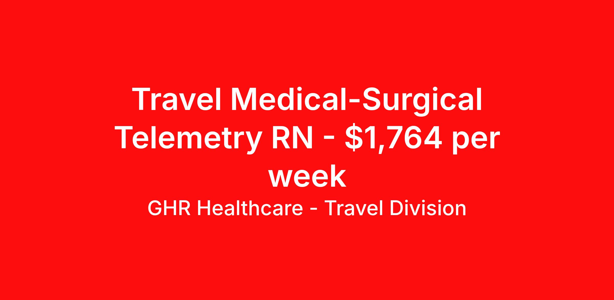 GHR Healthcare - Travel Division is seeking a travel nurse RN Med Surg / Telemetry for a travel nursing job in Orangeburg, South Carolina. Job Description & Requirements Specialty: Med Surg / Telemetry Discipline: RN Start Date: 04/07/2026 Duration: 13 weeks 36 hours per week Shift: 12 hours Employment Type: Travel GHR Healthcare - Travel Division Job ID 75567423. Pay package is based on 12 hour shifts and 36 hours per week (subject to confirmation) with tax-free stipend amount to be determined. About GHR Healthcare - Travel Division For over 30 years, GHR Healthcare has been the bridge between healthcare professionals and the facilities that need them nationwide. We're committed to uncovering your ideal fit, supported by GHR's dedication to competitive compensation, transparent communication, and a devoted team that genuinely cares about your career journey. You can trust us to stand by your side as your advocate, confidante, and partner in advancing your career. At GHR, care and consideration are at the heart of everything we do. Visit ghrhealthcare.com to learn more.