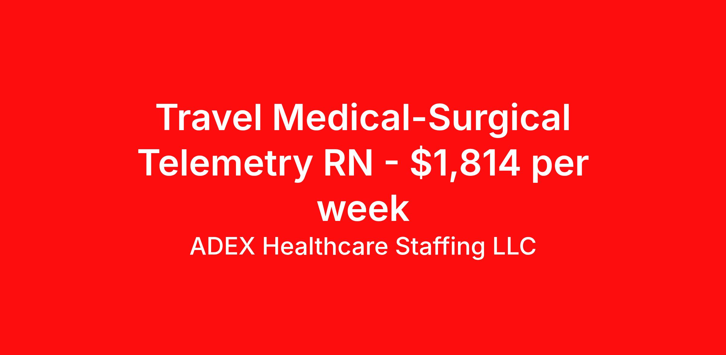 ADEX Healthcare Staffing LLC is seeking a travel nurse RN Telemetry for a travel nursing job in Orangeburg, South Carolina. Job Description & Requirements Specialty: Telemetry Discipline: RN Start Date: 04/07/2026 Duration: 13 weeks 36 hours per week Shift: 12 hours, nights Employment Type: Travel RN Position Job Notes: Travel or Local Registered Nurse needed for ASAP start. A minimum of 2 years of recent hospital bedside experience is required. Candidates must be able to start within 5 weeks. Opportunity for extension upon successful completion of the initial assignment. $750 referral bonus available. Opportunity: RN - Med Surg Tele Job Details: • Work 3x12 night shifts from 6:45 PM to 7:15 AM • Patient ratio of 1:5 • Every other weekend requirement • No on-call responsibilities • May be required to float within scope to meet facility needs • 2 years of experience required • First-time travelers accepted • South Carolina license or Compact license must be in hand prior to start • Required certifications: BLS, ACLS, NIHSS • Experience required in MS/Tele, Telemetry, Interpretation of Dysrhythmias, and Telemetry monitoring on the unit • Community hospital experience preferred • Epic charting system experience preferred • Royal blue scrubs required • 24 hours of orientation • Care for adult and geriatric patients with common medical conditions including diabetes, hypertension, coronary artery disease, ESRD, chronic respiratory illnesses, and arrhythmias • 30-room, 30-bed unit with interdisciplinary support including physical therapy, respiratory services, pharmacy, and rapid response teams • Facility may call off 1 shift per 2 weeks • Must be aware of potential emergency response team assignments during hurricane season (June-November) • Flu vaccine required with medical/religious exemptions only Facility: This acute care hospital features 286 staffed beds and provides comprehensive medical services to the community. The facility utilizes Epic charting system and offers free parking for staff. The organization maintains high standards for patient care with extensive interdisciplinary support services including physical therapy, respiratory services, interpretation services, phlebotomy, radiology, social services, rapid response teams, and pharmacy support. Location: Orangeburg, SC Orangeburg offers a welcoming small-town atmosphere in South Carolina with rich history and Southern charm. The area provides affordable living costs and easy access to both outdoor recreation and larger metropolitan areas, making it an attractive location for healthcare professionals seeking a balanced lifestyle. Adex Job ID 3184997. Pay package is based on 12 hour shifts and 36 hours per week (subject to confirmation) with tax-free stipend amount to be determined. About ADEX Healthcare Staffing LLC ADEX has been placing healthcare professionals across the US since 2004. Originally founded in Atlanta, GA, the company's headquarters are now located in Tampa, FL. JCAHO certified since 2009. Benefits Referral bonus