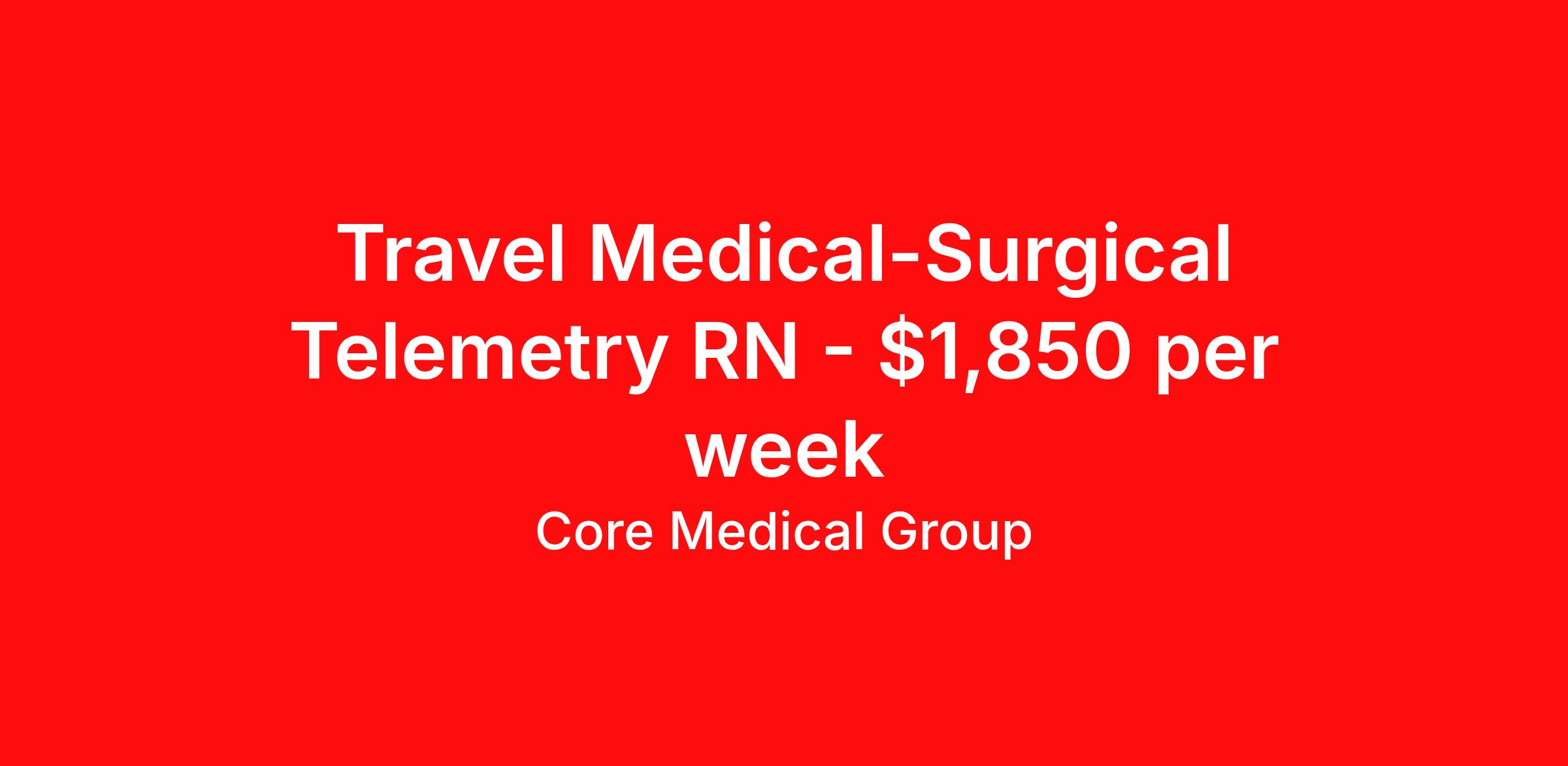 Core Medical Group is seeking a travel nurse RN Med Surg / Telemetry for a travel nursing job in Northport, Alabama. Job Description & Requirements Specialty: Med Surg / Telemetry Discipline: RN Start Date: 04/13/2026 Duration: 13 weeks 36 hours per week Shift: 12 hours Employment Type: Travel Client in AL seeking Registered Nurse: Telemetry/PCU/Stepdown for the following shift(s): Nights We are looking for a healthcare professional who is ready to provide exceptional patient care in this contract/travel role. Contract/travel assignments are typically 13 weeks, with potential to extend. Help us continue our mission to connect people, improve lives, and give back to the community by joining the CoreMedical Group team. When you work with CoreMedical Group, we put you first and treat you like family, supporting you every step of the way. CoreMedical Group is one of the largest healthcare staffing agencies in the country, with travel and contract positions located across the United States. Our recruiters will help you find the perfect job, whether it's across the country or across the street. In addition to dedicated, personalized support from your recruiter, when you work with CoreMedical Group you'll receive: Access to an extensive benefits package, including day 1 health, dental, and vision insurance, employer paid life insurance, a health reimbursement account, and more! Weekly paychecks with competitive pay packages Matching 401(k) benefits to help you save for retirement Licensure assistance and reimbursement to set you up for success on your contract Travel reimbursement and dedicated housing support while on assignment Referral cash bonuses when you connect us with other clinicians CoreMedical Group also offers you a free, all-inclusive vacation each year as our way of saying "thank you" for your hard work. Join other healthcare professionals on the annual Club CoreMed retreat and you'll see why our contract and travel professionals come back to us year after year! Your career is too valuable to tackle on your own. Let CoreMedical Group help you with your healthcare journey! *Estimate of weekly payments is intended for informational purposes and includes hourly wages, as well as reimbursements for meal & incidental expenses, and housing expenses incurred on behalf of the Company. Any benefits (medical/dental/vision) are in addition to the weekly pay. Please speak with your Recruiter for additional details. Estimated payments are subject to change until formal offer of assignment is made and accepted. Core Medical Group Job ID 1366620. Pay package is based on 12 hour shifts and 36 hours per week (subject to confirmation) with tax-free stipend amount to be determined. Posted job title: RN About Core Medical Group CoreMedical Group is one of the largest healthcare staffing agencies in the country. We have jobs nationwide in travel nursing, travel allied health, interim, locum tenens, and permanent placements! Join the staffing agency with Club CoreMed, the best perk in the industry - an all inclusive paid trip to a tropical resort! Benefits Weekly pay Holiday Pay Guaranteed Hours Continuing Education 401k retirement plan Pet insurance Company provided housing options Sick pay Wellness and fitness programs Mileage reimbursement Referral bonus Employee assistance programs Medical benefits Dental benefits Vision benefits Benefits start day 1 License and certification reimbursement Life insurance Discount program