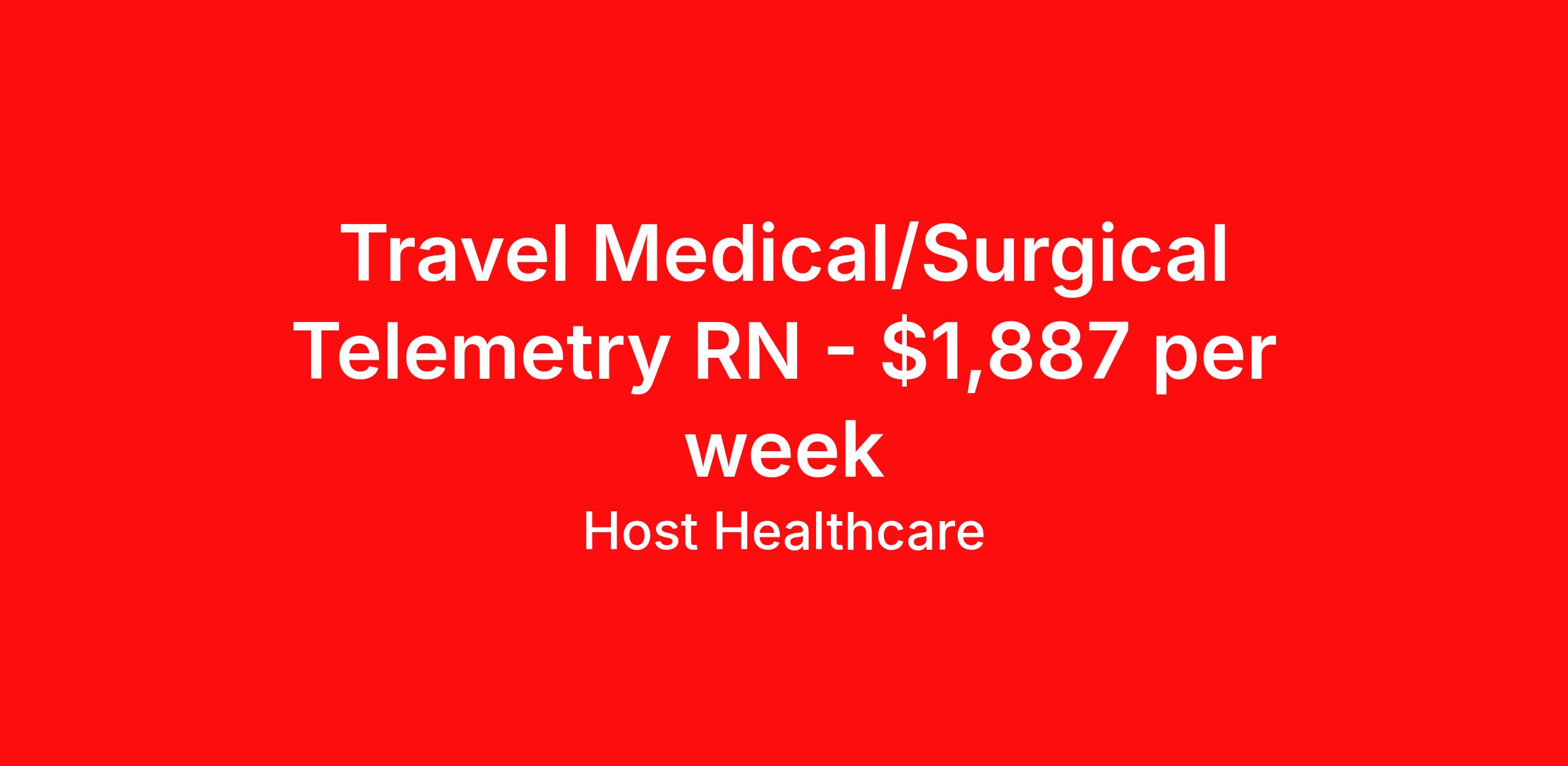 Host Healthcare is seeking a travel nurse RN Med Surg / Telemetry for a travel nursing job in Mequon, Wisconsin. Job Description & Requirements Specialty: Med Surg / Telemetry Discipline: RN Start Date: 04/12/2026 Duration: 13 weeks 36 hours per week Shift: 12 hours, nights Employment Type: Travel Host Healthcare Job ID a1fVX000002nXCzYAM. Pay package is based on 12 hour shifts and 36 hours per week (subject to confirmation) with tax-free stipend amount to be determined. Posted job title: RN - Medical-Surgical About Host Healthcare At Host Healthcare, we provide a truly comfortable experience as you explore your travel nursing, therapy, or allied career. We make your travel healthcare journey easy by taking care of all the details, so you don’t have to. We are on a mission to help others live better and we do this by helping the healers of the world be as comfortable as possible. With access to tens of thousands of travel nursing, therapy, and allied jobs in all 50 states, our responsive and friendly recruiters find your dream position based on what’s important to you. During your assignment, get access to premium benefits, including Day 1 medical that continues up to 30 days between assignments, 401K matching, travel reimbursements, dedicated housing support, and more. We also offer 24/7 support from our team and access to our on-staff clinicians so you can feel comfortable and confident throughout your entire assignment. Travel comfortably with Host Healthcare. Benefits Referral bonus School loan reimbursement Vision benefits Wellness and fitness programs Company provided housing options License and certification reimbursement Life insurance Medical benefits Mileage reimbursement Pet insurance Discount program Employee assistance programs Guaranteed Hours Health savings account Holiday Pay 401k retirement plan Continuing Education Dental benefits