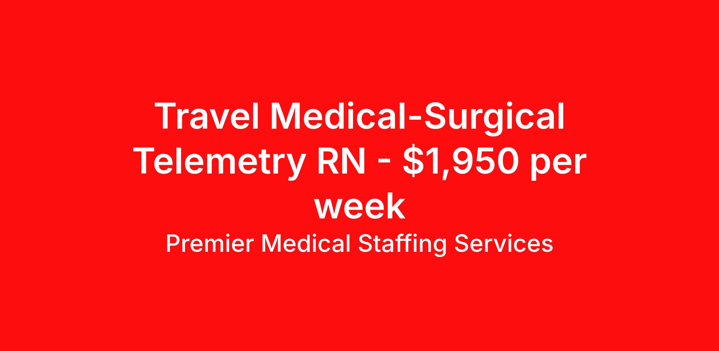 Premier Medical Staffing Services is seeking a travel nurse RN Med Surg / Telemetry for a travel nursing job in Baltimore, Maryland. Job Description & Requirements Specialty: Med Surg / Telemetry Discipline: RN Start Date: 04/28/2026 Duration: 13 weeks 36 hours per week Shift: 12 hours Employment Type: Travel Premier Medical Staffing Job ID 626155. Pay package is based on 12 hour shifts and 36 hours per week (subject to confirmation) with tax-free stipend amount to be determined. Posted job title: RN Tele Med/Surg About Premier Medical Staffing Services Premier Medical Staffing Services, LLC is a nationally expanding healthcare staffing firm for healthcare professionals and companies. We understand our clients’ need for highly qualified, expertly trained medical professionals and are passionate about helping clinicians find employment opportunities that fit their personality and needs. Able to accommodate the ever-changing needs of the healthcare landscape, we offer per-diem, contract and direct hire placements to support the unique needs of each industry sector. Premier Medical Staffing Services is Joint Commission Certified, a Military Spouse Employment Partner and is certified as a Women’s Business Enterprise. We are proudly nurse owned.
