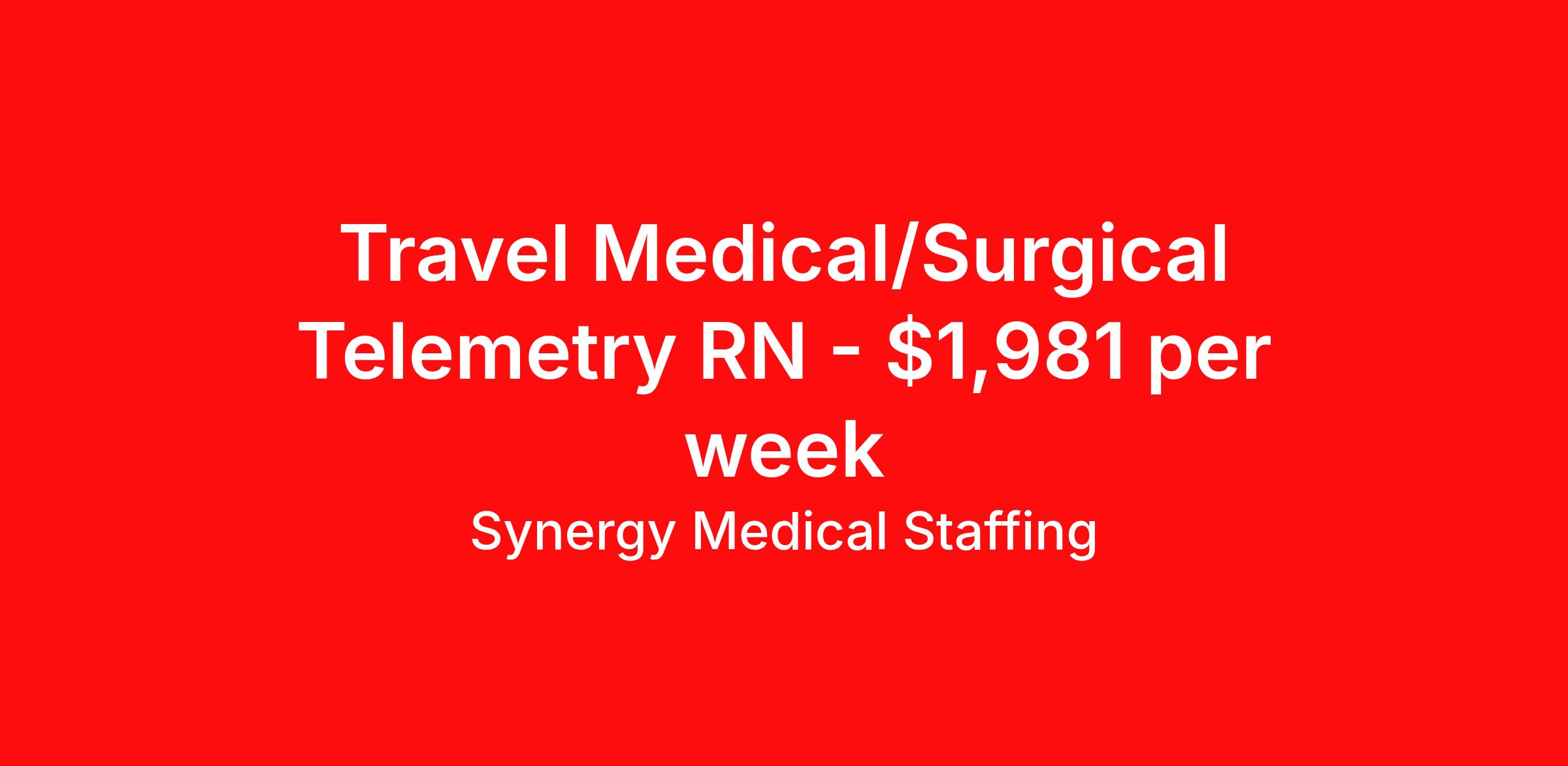 Synergy Medical Staffing is seeking a travel nurse RN Telemetry for a travel nursing job in Grove City, Ohio. Job Description & Requirements Specialty: Telemetry Discipline: RN Start Date: 03/23/2026 Duration: 13 weeks 36 hours per week Shift: 12 hours, nights Employment Type: Travel Travel, RN - Tele Location: Grove City, Ohio Shift: 3X12 Nights, 19:00:00-07:00:00, 12.00-3 Duration 13 Weeks When you join Synergy Medical Staffing, you’ll have a dedicated recruiter helping you at all times. Your recruiter is a cross between a career coach and a concierge. They will help you fine-tune your resume, find your next job, and locate an apartment (even one that takes pets!). Make one call and get help with everything from placement to housing to payroll, even travel directions! As a travel, contract and permanent placement medical staffing company with over 20 years of experience in the industry, we understand your needs. Synergy’s Benefits are best in class and include the following: 401K that matches up to 5% of your pay and you are 100% vested from Day 1. Medical, Dental, Vision, Life insurance, Long and short-term disability and others Loyality Program Weekly pay Holiday Pay (varies by Assignment) Guaranteed Hours (varies by Assignment) Referral bonus Continuing Education License and certification reimbursement Synergy Medical Staffing Job ID 36192142. Pay package is based on 12 hour shifts and 36.0 hours per week (subject to confirmation) with tax-free stipend amount to be determined. Posted job title: RN:Tele,19:00:00-07:00:00 About Synergy Medical Staffing When you join Synergy Medical Staffing, you’ll have a dedicated recruiter helping you at all times. Your recruiter is a cross between a career coach and a concierge. They will help you fine-tune your resume, find your next job, and locate an apartment (even one that takes pets!). Make one call and get help with everything from placement to housing to payroll, even travel directions! As a travel, contract and permanent placement medical staffing company with over 12 years of experience in the industry, we understand your needs. Are you interested in traveling, or just a job around the corner? Whatever your preference, you can be sure there are plenty of Nursing Jobs, Allied Jobs and Physical Therapy Jobs, Occupational Therapy Jobs, Speech Therapy Jobs and Rehab Therapy jobs anywhere you want to go. Synergy Medical Staffing professionals have been in the Medical staffing employment and staffing industry for over 12 years, and have developed solid relationships with numerous healthcare facilities nationwide. Contact us now and expand your medical career with new opportunities from Synergy Medical Staffing. Synergy’s Benefits are best in class and include the following 401K Day 1 Full Medical, Dental, Vision, Life insurance, Long and short term disability and others Student Loan Repayment and CEU reimbursement Loyalty bonus after 600 hours Benefits Discount program Weekly pay Holiday Pay Guaranteed Hours Referral bonus Medical benefits Dental benefits Continuing Education License and certification reimbursement Life insurance 401k retirement plan Cancelation protection Vision benefits