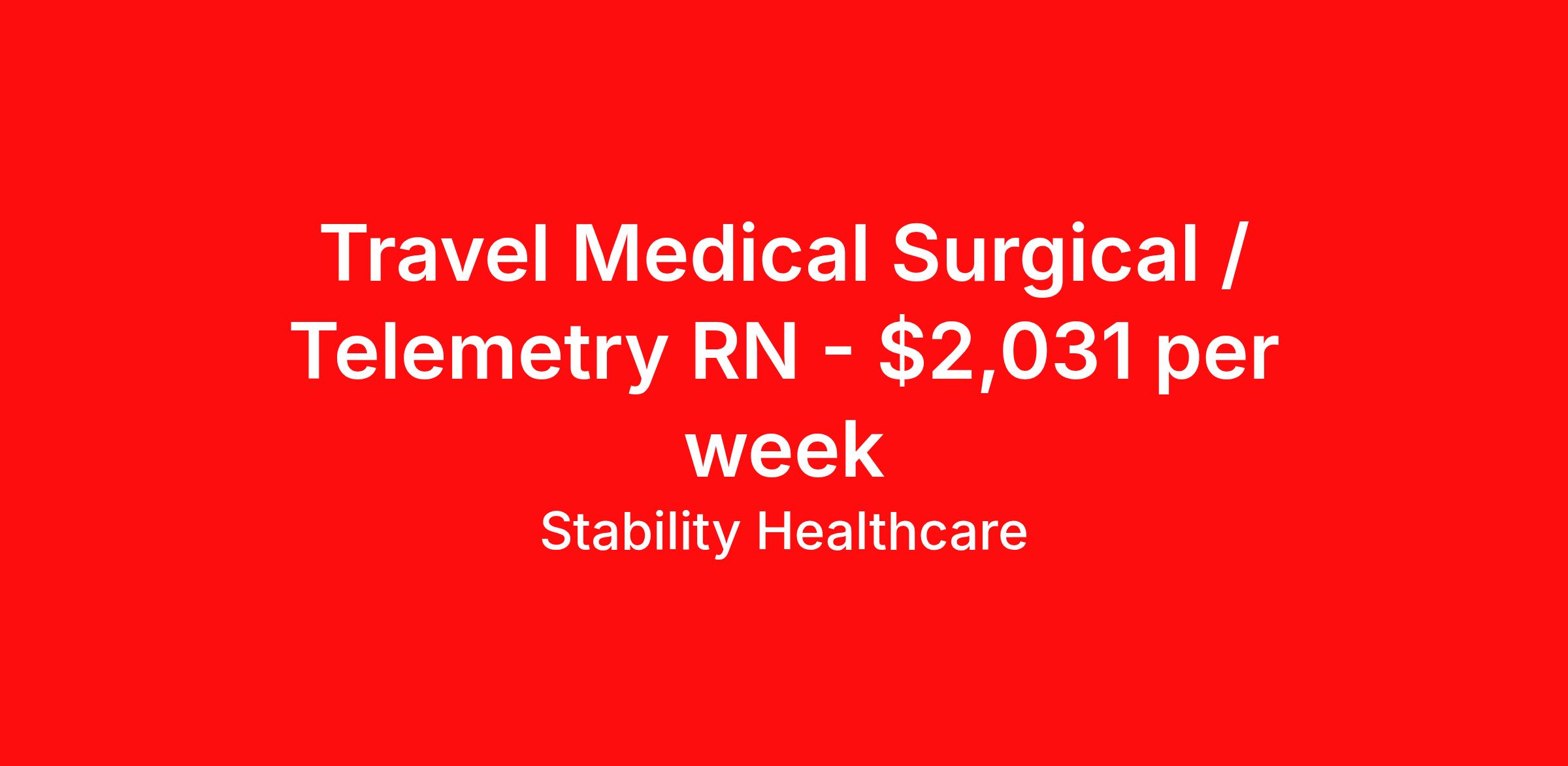 Stability Healthcare is seeking a travel nurse RN Med Surg for a travel nursing job in Newburgh, Indiana. Job Description & Requirements Specialty: Med Surg Discipline: RN Start Date: 04/20/2026 Duration: 13 weeks 36 hours per week Shift: 12 hours, nights Employment Type: Travel Stability Healthcare is looking for a Med-Surg RN contract position in Newburgh, IN. The majority of hospitalized patients are admitted to M/S either directly or after surgery. M/S is also where patients who have been in critical care (ICU) are transferred when they no longer need critical care but still require nursing care. *$600 travel bonus *Day 1 health insurance with United Healthcare *PTO plan start accruing on day 1, use during contract or cash out at the end! *Guaranteed stipend if facility calls you off *Extra hour bonus earn an additional hourly bonus for working over your weekly contracted hours Stability Job ID 827203. Pay package is based on 12 hour shifts and 36 hours per week (subject to confirmation) with tax-free stipend amount to be determined. Posted job title: Med-Surg About Stability Healthcare Stability Healthcare was founded in 2009, with the mission of becoming the best Travel Nursing Agency in California. We have been rated one of the top travel nursing agencies and offer our nurses the highest paying travel nursing jobs available. We have access to the best travel assignments from 1000’s of facilities. You can start the year off in sunny California, spend the Spring in the Colorado Rockies, enjoy the Summer in the Mid-West, experience the change of seasons in Boston and New York, and hit the beaches of Florida in the winter. Our Nurses work in the best hospitals and health systems in the country. Benefits Guaranteed Hours Benefits start day 1