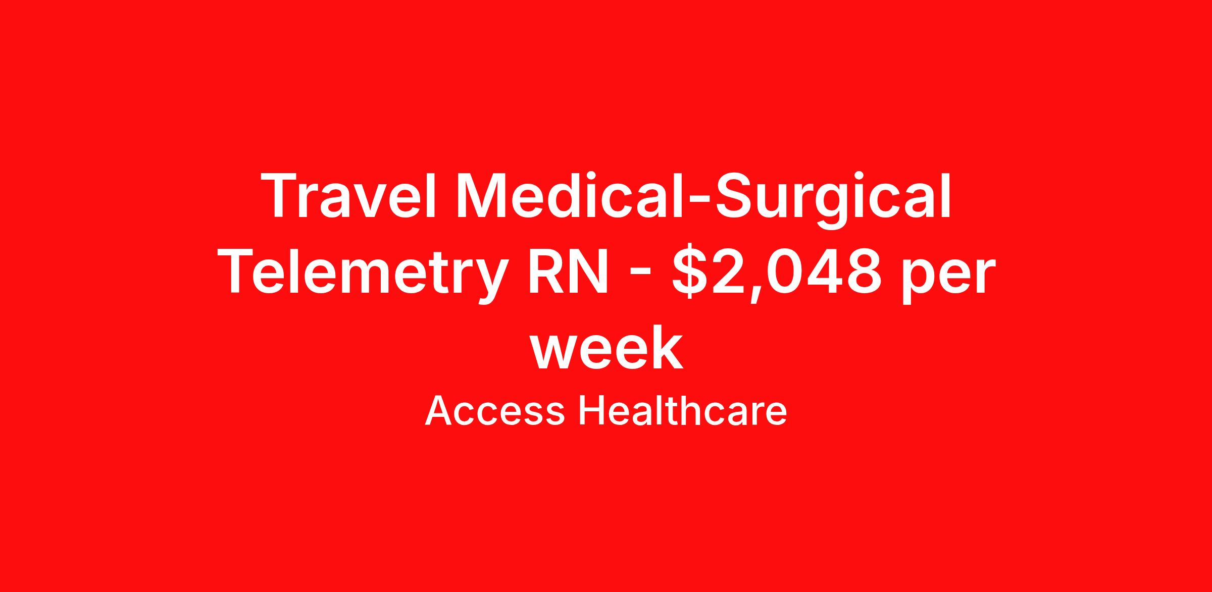 Access Healthcare is seeking a travel nurse RN Med Surg / Telemetry for a travel nursing job in Greensboro, North Carolina. Job Description & Requirements Specialty: Med Surg / Telemetry Discipline: RN Start Date: 04/06/2026 Duration: 13 weeks 36 hours per week Shift: 12 hours, nights Employment Type: Travel Access Healthcare Job ID 76290240. Pay package is based on 12 hour shifts and 36 hours per week (subject to confirmation) with tax-free stipend amount to be determined. About Access Healthcare Access Healthcare aims to provide superior service to our nursing family by providing around the clock support, competitive pay packages and an unmatched benefits package! Unlike other agencies, we offer a true family feel and work with you to find the placement that is right for you. We offer one of the top leading pay packages in the industry and we are ready to get you the money you deserve! Access Healthcare was founded by two travel nurses, Danielle and Diego, who had a dream and a shared vision of creating an agency which all nurses would want to work with. Our passion has led us to where we are today as one of the top 10 agencies in our home state of New Jersey, with access to contracts in all 50 states! We encourage you to join our team and we cannot wait to get to know you!