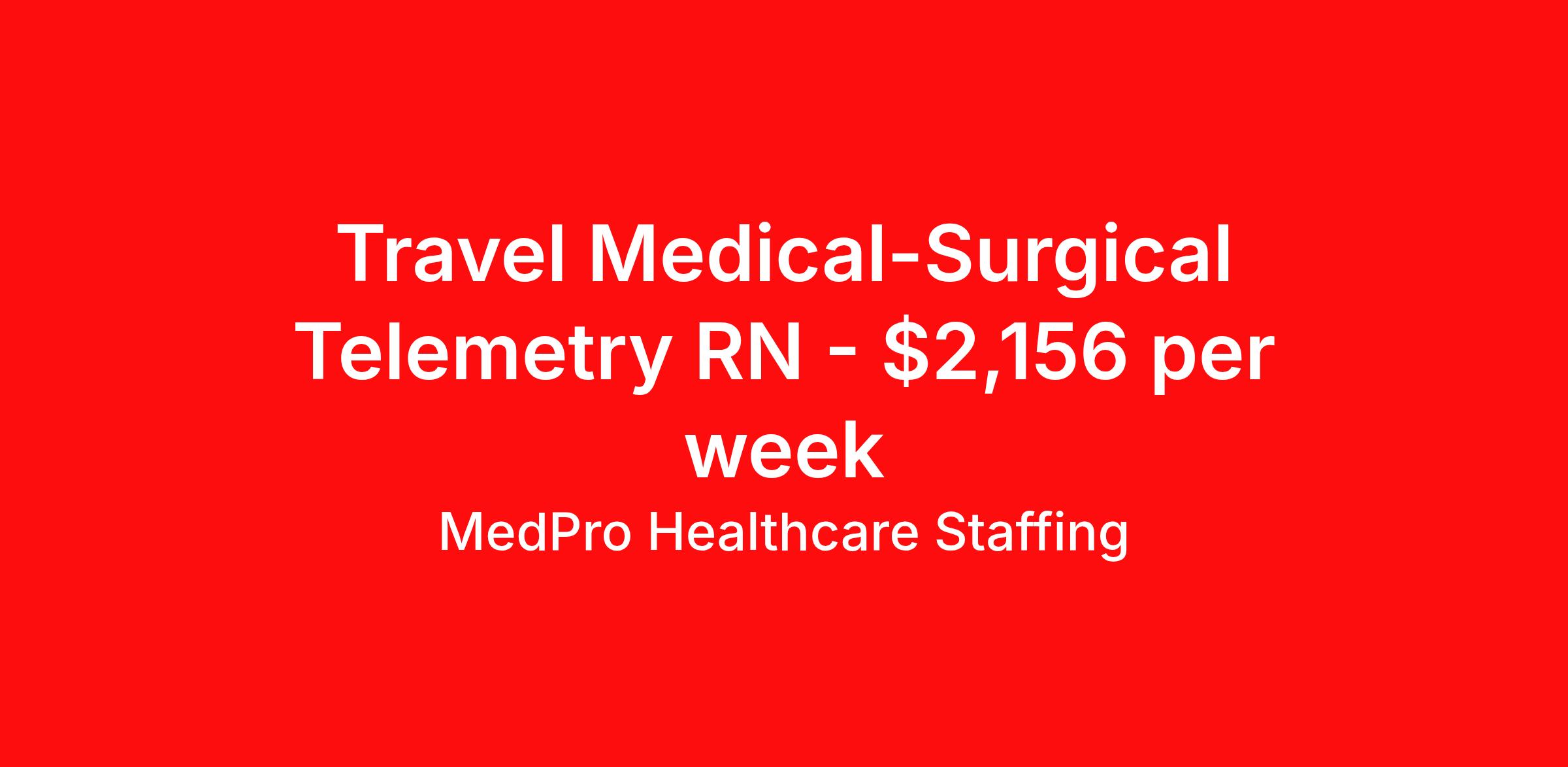 MedPro Healthcare Staffing is seeking a travel nurse RN Med Surg / Telemetry for a travel nursing job in Rochester, New York. Job Description & Requirements Specialty: Med Surg / Telemetry Discipline: RN Start Date: 04/07/2026 Duration: 13 weeks 36 hours per week Shift: 12 hours, nights Employment Type: Travel MedPro Healthcare Staffing , a Joint Commission-certified staffing agency, is seeking a quality Med-Surg registered nurse (RN) for a travel assignment with one of our top healthcare clients. Requirements Active RN License Degree from accredited nursing program BLS Certifications Eighteen months of recent experience in an Acute Care Med/Surg setting Other requirements to be determined by our client facility Benefits Weekly pay and direct deposit Full coverage of all credentialing fees Private housing or housing allowance Group Health insurance for you and your family Company-paid life and disability insurance Travel reimbursement 401(k) matching Unlimited Referral Bonuses up to $1,000 Duties Responsibilities Med-Surg Nurses (RN) provide care for primarily adult patients before and after surgical procedures; they also attend to those who are being treated with pharmaceuticals to manage illness. Due to the broad range of medical conditions Med/Surg Nurses will encounter, they must be well-versed in a large variety of health conditions. Complete assignments made by physicians. Provide routine treatment and post-surgical care. Assess changes in patient's health status and perform various treatments. Administer medication. Meticulous documentation as to medication and treatment administration to ensure continuity of care between nursing staff, physicians and other treatment team members. About Agency MedPro Healthcare Staffing is a Joint Commission certified provider of contract staffing services. Since 1983, we have placed nursing and allied travelers in top healthcare facilities nationwide. Join us today for your very own MedPro Experience®. If qualified and interested, please call for immediate consideration. MedPro Staffing is an Equal Opportunity Employer. All applicants will be considered for employment without attention to race, color, religion, national origin, age, sex, disability, marital status or veteran status. Key Words: Registered Nurse, RN, Medical-Surgical, Travel Nurse, Contract Nurse, Agency Nurse, Agency RN, RN-MS, RN- Medical Surgical, Travel RN, Contract, Nursing, RN Med-Surg, Travel Nursing *Weekly payment estimates are intended for informational purposes only and include a gross estimate of hourly wages and reimbursements for meal, incidental, and housing expenses. Your recruiter will confirm your eligibility and provide additional details. MedPro Job ID a0Fcx00000HkuWrEAJ. Pay package is based on 12 hour shifts and 36 hours per week (subject to confirmation) with tax-free stipend amount to be determined. Posted job title: Med-Surg/Telemetry Registered Nurse Nursing: Med Surg/Tele. About MedPro Healthcare Staffing At MedPro Healthcare Staffing , we believe no one cares more for caregivers than we do. Our mission is simple: you focus on your patients, and we’ll take care of the rest. As a Joint Commission-certified leader in temporary and contract healthcare staffing since 1983, MedPro has proudly connected nursing and allied travelers with top healthcare facilities across the nation. With thousands of job opportunities available nationwide, we make it easy to find assignments that align with your goals and lifestyle. Our on-staff clinical support team—alongside a compassionate group of experienced recruiters—provides hands-on guidance every step of the way. From Day 1 medical benefits and a 401(k) plan to personalized career support, we’re committed to ensuring every professional we serve feels valued, cared for, and empowered to succeed. Guided by a CEO who is a Registered Nurse, MedPro is built on a foundation of clinical insight and genuine compassion for the caregiving community. Through The MedPro Experience® , we deliver travel assignments that are rewarding, memorable, and designed to help you DREAM big, EXPLORE often, and ACHIEVE greatness. Benefits Day 1 medical, dental, and vision benefits for you and your family Weekly pay and direct deposit Unlimited Referral Bonuses starting at $500 On Staff Clinical Support Team Access to nationwide travel assignments MPX Mobile app -24/7 real-time access to jobs, credentials, assignment details, and more Full coverage of all credentialing fees Private housing or housing allowance Tax Free Per Diems, Housing Stipends and Travel Reimbursements Company-paid life and disability insurance Travel reimbursement 401(k) matching Benefits Weekly pay Referral bonus Employee assistance programs