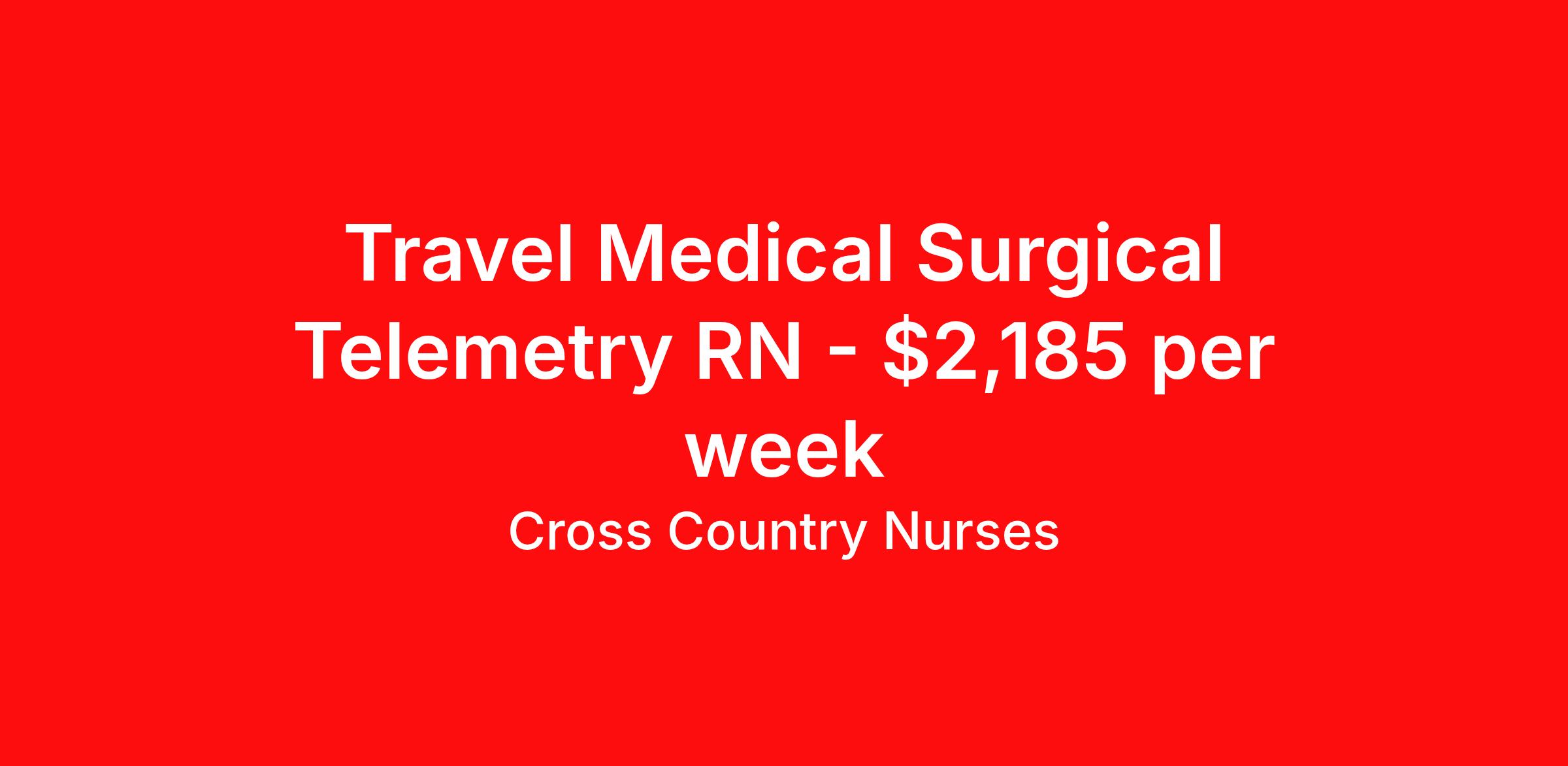 Cross Country Nurses is seeking a travel nurse RN Med Surg / Telemetry for a travel nursing job in Alexandria, Louisiana. Job Description & Requirements Specialty: Med Surg / Telemetry Discipline: RN Start Date: 04/06/2026 Duration: 13 weeks 36 hours per week Shift: 12 hours, nights Employment Type: Travel Job Description As a medical/surgical telemetry nurse (RN M/S-T), you will extend care to patients who are coping with illness, injury or other medical or surgical circumstances. This includes assessing their condition, using telemetry to monitor blood pressure, heart rhythm, respiration and oxygen saturation, administering medication, changing dressings and documenting information in patient charts. You'll also provide continued support and education to patients, promoting their overall health and ensuring that they have the tools to adequately recuperate and prevent further health issues. Minimum Requirements At least 1 year of recent acute care experience in specialty Active RN license Benefits The benefits of taking a travel nursing job with Cross Country include: Private housing or generous housing allowance Comprehensive health insurance with prescription coverage Dependent health insurance with prescription coverage Competitive salaries Referral bonuses Travel reimbursement 401(k) retirement plan Direct deposit/free checking Unlimited free CE credits Cross Country Job ID 1230518. Pay package is based on 12 hour shifts and 36 hours per week (subject to confirmation) with tax-free stipend amount to be determined. Posted job title: Registered Nurse / Medical Surgical With Telemetry About Cross Country Nurses You care for others — we’re here to care for you. At Cross Country, we know travel nursing is about more than just the job. It’s about building a career that supports your lifestyle, your values, and your impact. We offer competitive pay, full benefits, and 24/7 support from a team that truly understands what it means to be on the front lines. Wherever your journey takes you, we’re with you every step of the way. Let’s build your best life — one assignment at a time. Benefits 401k retirement plan Referral bonus