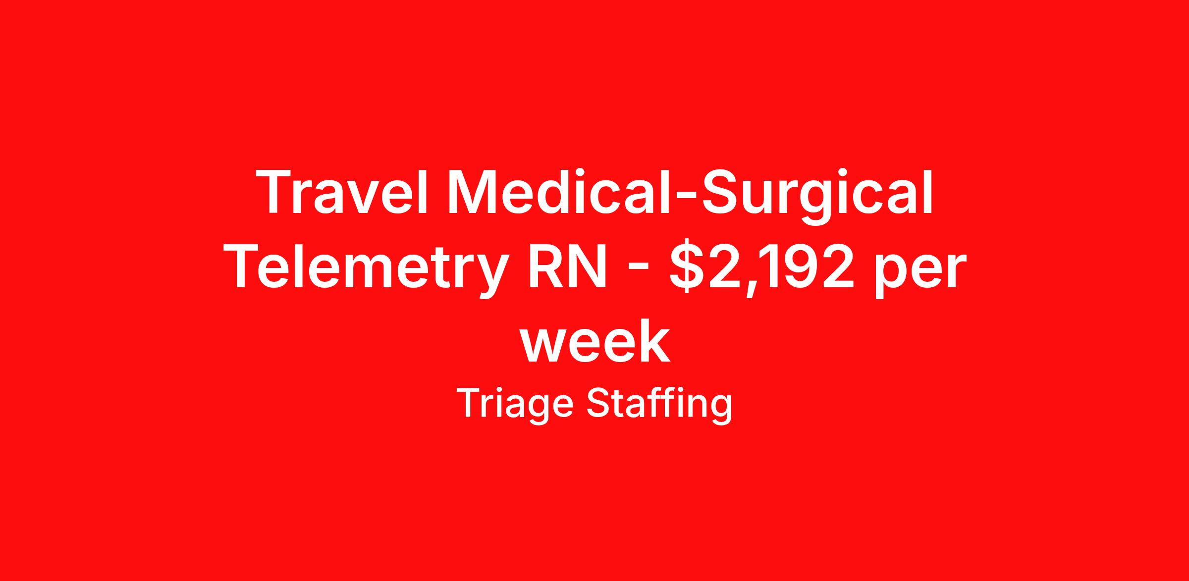 Triage Staffing is seeking a travel nurse RN Med Surg / Telemetry for a travel nursing job in North Adams, Massachusetts. Job Description & Requirements Specialty: Med Surg / Telemetry Discipline: RN Start Date: 04/13/2026 Duration: 13 weeks 36 hours per week Shift: 12 hours, flexible Employment Type: Travel Travel Nursing: Med/Surg Massachusetts Location: Massachusetts Start Date: 4/13/2026 Shift Details: 12H Variable 36 hours per week Length: 13 WEEKS Apply for specific facility details.Med Surg RN Triage Staffing Job ID HWM6NT4A. Posted job title: Nursing: Med/Surg About Triage Staffing At Triage, we prefer to be real . Real about expectations—both ours and yours. Real about how a decision you make today could affect your tomorrows. Real about how compensation actually works. Real about how great—or grating—your next supervisor may be. Being real allows everyone at Triage to be ready . Ready to serve you with real honesty. So if that gig near the ocean is really no day at the beach, or that third shift comes with a second-class rate, we tell you. So you can be ready, too. We staff all five major divisions of acute care—nursing, lab, radiology, cardiopulmonary and rehab therapy, offering: - Competitive, custom pay packages - One point of contact for both travelers and facilities (per division) - A reliable recruiter who's got your back throughout your entire assignment - In-house compliance and accounting specialists - A clinical liaison team available 24/7 to offer medical and professional support and career development - A mentoring program that is run and managed by actual clinicians—yeah, you read that right - And more (because of course there’s more) Are we the biggest? No. Are we the best? That’s rather subjective, but we’re trying to be. Will we work like hell to get you as close to your idea of heaven as possible? Yes. Yes, we will. Benefits: Day One comprehensive, nationwide insurance plans for health, vision and dental and life—including a HSA option Day One 401(k) program with employer-matching contributions once eligible Facility cancelling protection—your time is money on and off-the-clock Guaranteed hours Weekly paychecks via direct deposit Earned vacation bonuses for time worked Paid holidays Employee assistance program (EAP)—your mental health is important, too Continuing education, certification and licensing reimbursement Workers comp—because accidents happen Top-rated professional liability insurance Company provided housing options Referral bonus—$750 in your pocket after they’ve completed a 13-week assignment