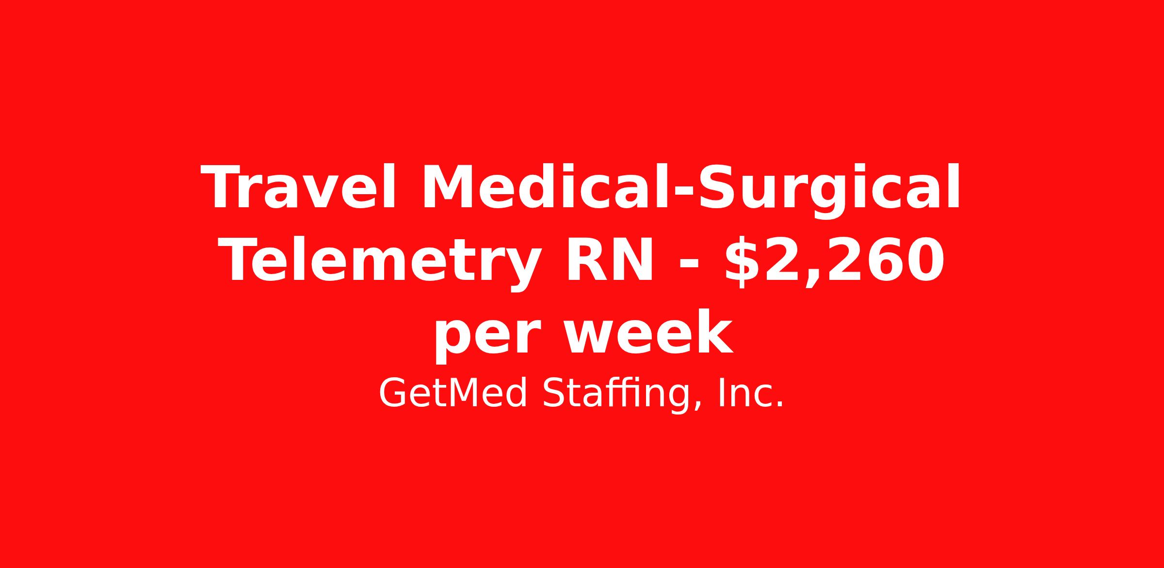 GetMed Staffing, Inc. is seeking a travel nurse RN Telemetry for a travel nursing job in Fayetteville, North Carolina. Job Description & Requirements Specialty: Telemetry Discipline: RN Start Date: 04/20/2026 Duration: 13 weeks 48 hours per week Shift: 12 hours, nights Employment Type: Travel GetMed Staffing is searching for a strong Telemetry RN to assist our traveler-friendly client. A minimum of 1-2 years of experience is required. Traveling with GetMed Staffing offers the unique opportunity to gain diverse experiences, both personally and professionally. Gain experience that matters. GetMed Staffing, Inc. Job ID 36167279. Pay package is based on 12 hour shifts and 48.0 hours per week (subject to confirmation) with tax-free stipend amount to be determined. Posted job title: RN:Telemetry,19:00:00-07:00:00 About GetMed Staffing, Inc. We are a diversity owned company, specializing in healthcare recruiting services. We truly understand how important a healthcare travelers' relationship is with their recruiter, as well as our relationship is with our healthcare facilities. We recognize that the needs of our healthcare travelers can vary, and therefore we provide the personalized touch necessary to ensure a successful travel assignment each and every time. Our healthcare facilities and clients benefit from us putting our healthcare travelers first. GetMed Staffing is excited to be a leader within the industry by focusing on providing healthcare travelers with more choices and possibilities as they plan for their next healthcare travel assignment. Benefits Life insurance Medical benefits Dental benefits Vision benefits 401k retirement plan
