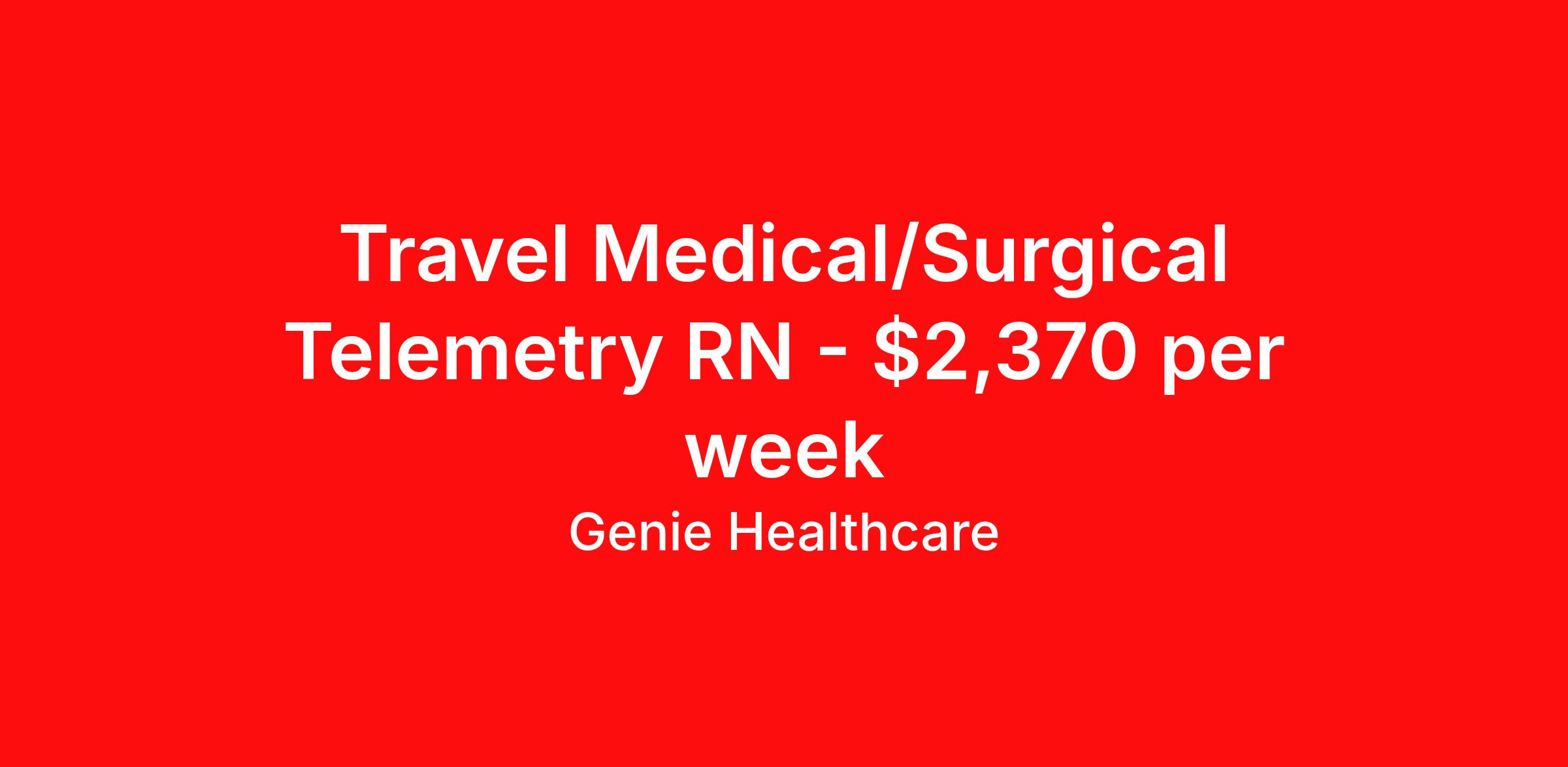 Genie Healthcare is seeking a travel nurse RN Med Surg / Telemetry for a travel nursing job in Hartford, Connecticut. Job Description & Requirements Specialty: Med Surg / Telemetry Discipline: RN Start Date: ASAP Duration: 13 weeks 36 hours per week Shift: 12 hours, days Employment Type: Travel Genie Healthcare is looking for a RN to work in Emergency Room (ER) for a 13 weeks travel assignment located in Hartford, CT for the Shift (3x12hr days, 07:00:00-19:00:00, 12.00-3). Pay and benefits packages are estimated based on client bill rate at time the job was posted. These rates are subject to change. Exact pay and benefits vary based on several things, including, but not limited to, guaranteed hours, client changes in bill rate, experience, etc. Benefits: Medical Insurance, Dental Insurance, Vision Insurance, 401(k) with company matching (50% up to 6% of what you contribute) Genie Healthcare Job ID 18154332. Pay package is based on 12 hour shifts and 36.0 hours per week (subject to confirmation) with tax-free stipend amount to be determined. Posted job title: RN:Emergency Room (ER),07:00:00-19:00:00 About Genie Healthcare Genie Healthcare is one of the fastest growing Nurse Travel Agencies in the USA. Genie serves hundreds of facilities and has over 4000 current travel RN contracts open at any given time. Genie provides travel RN’s flexibility, support, top pay scale, housing and the 1 rated, multi-state health insurance coverage. Genie Healthcare carries with it a commitment to providing a comprehensive level of service and quality care. Growing from a small team of eager recruiters to a company with satisfied clients in nearly every corner of the nation, delivering excellence in patient and customer care is the key to Genie’s success. The management team has 20 years of experience in workforce solutions and staffing in medical and non-medical fields, roles ranging from Clerical job to Cardiologist to software developer to CEO.