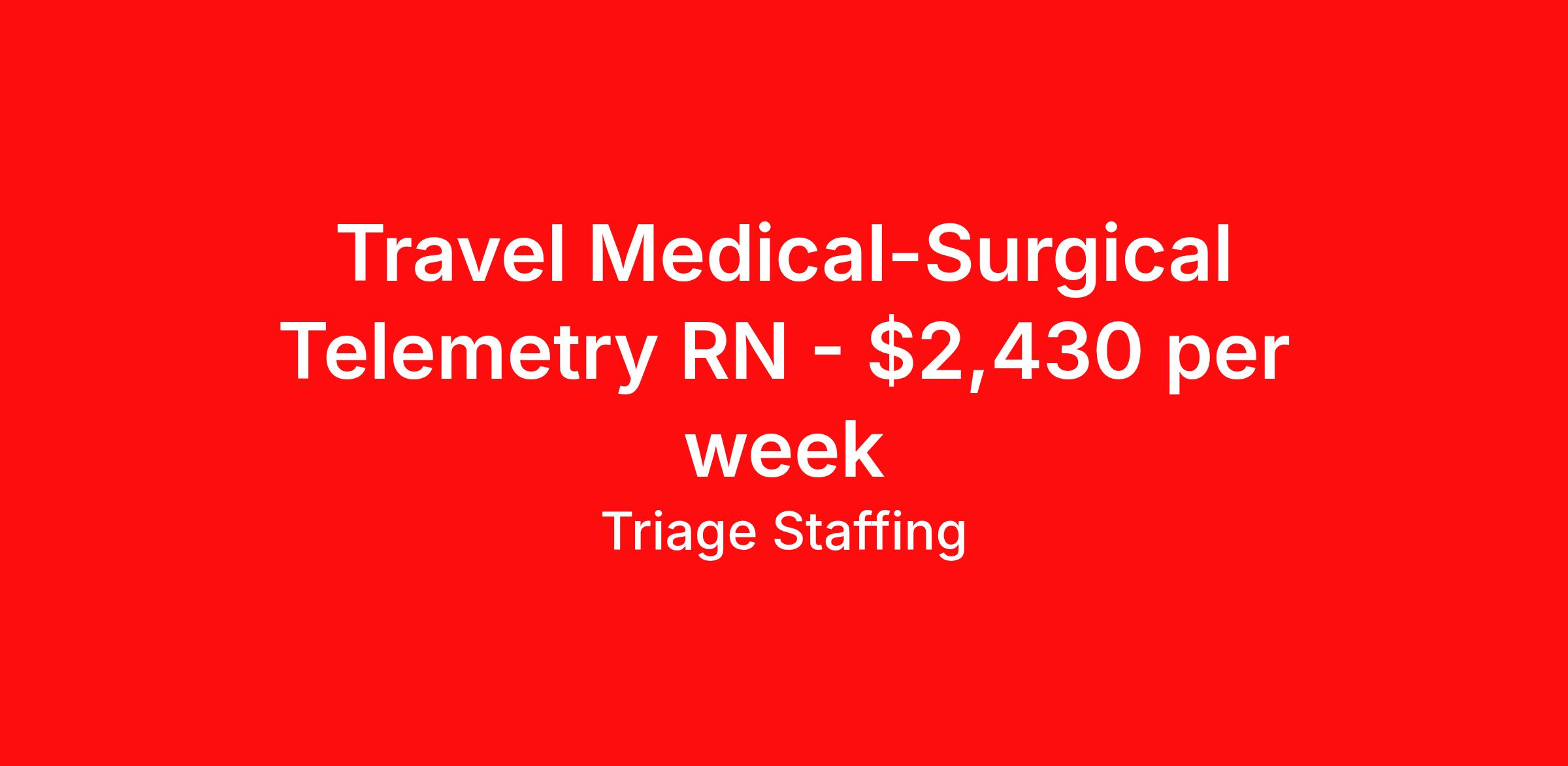 Triage Staffing is seeking a travel nurse RN Telemetry for a travel nursing job in Memphis, Tennessee. Job Description & Requirements Specialty: Telemetry Discipline: RN Start Date: 04/20/2026 Duration: 13 weeks 48 hours per week Shift: 12 hours, days Employment Type: Travel Travel Nursing: Telemetry Memphis Location: Memphis Start Date: 4/20/2026 Shift Details: 12H Days 48 hours per week Length: 13 WEEKS Apply for specific facility details.Telemetry RN Triage Staffing Job ID FWYHMYJT. Posted job title: Nursing: Telemetry About Triage Staffing At Triage, we prefer to be real . Real about expectations—both ours and yours. Real about how a decision you make today could affect your tomorrows. Real about how compensation actually works. Real about how great—or grating—your next supervisor may be. Being real allows everyone at Triage to be ready . Ready to serve you with real honesty. So if that gig near the ocean is really no day at the beach, or that third shift comes with a second-class rate, we tell you. So you can be ready, too. We staff all five major divisions of acute care—nursing, lab, radiology, cardiopulmonary and rehab therapy, offering: - Competitive, custom pay packages - One point of contact for both travelers and facilities (per division) - A reliable recruiter who's got your back throughout your entire assignment - In-house compliance and accounting specialists - A clinical liaison team available 24/7 to offer medical and professional support and career development - A mentoring program that is run and managed by actual clinicians—yeah, you read that right - And more (because of course there’s more) Are we the biggest? No. Are we the best? That’s rather subjective, but we’re trying to be. Will we work like hell to get you as close to your idea of heaven as possible? Yes. Yes, we will. Benefits: Day One comprehensive, nationwide insurance plans for health, vision and dental and life—including a HSA option Day One 401(k) program with employer-matching contributions once eligible Facility cancelling protection—your time is money on and off-the-clock Guaranteed hours Weekly paychecks via direct deposit Earned vacation bonuses for time worked Paid holidays Employee assistance program (EAP)—your mental health is important, too Continuing education, certification and licensing reimbursement Workers comp—because accidents happen Top-rated professional liability insurance Company provided housing options Referral bonus—$750 in your pocket after they’ve completed a 13-week assignment