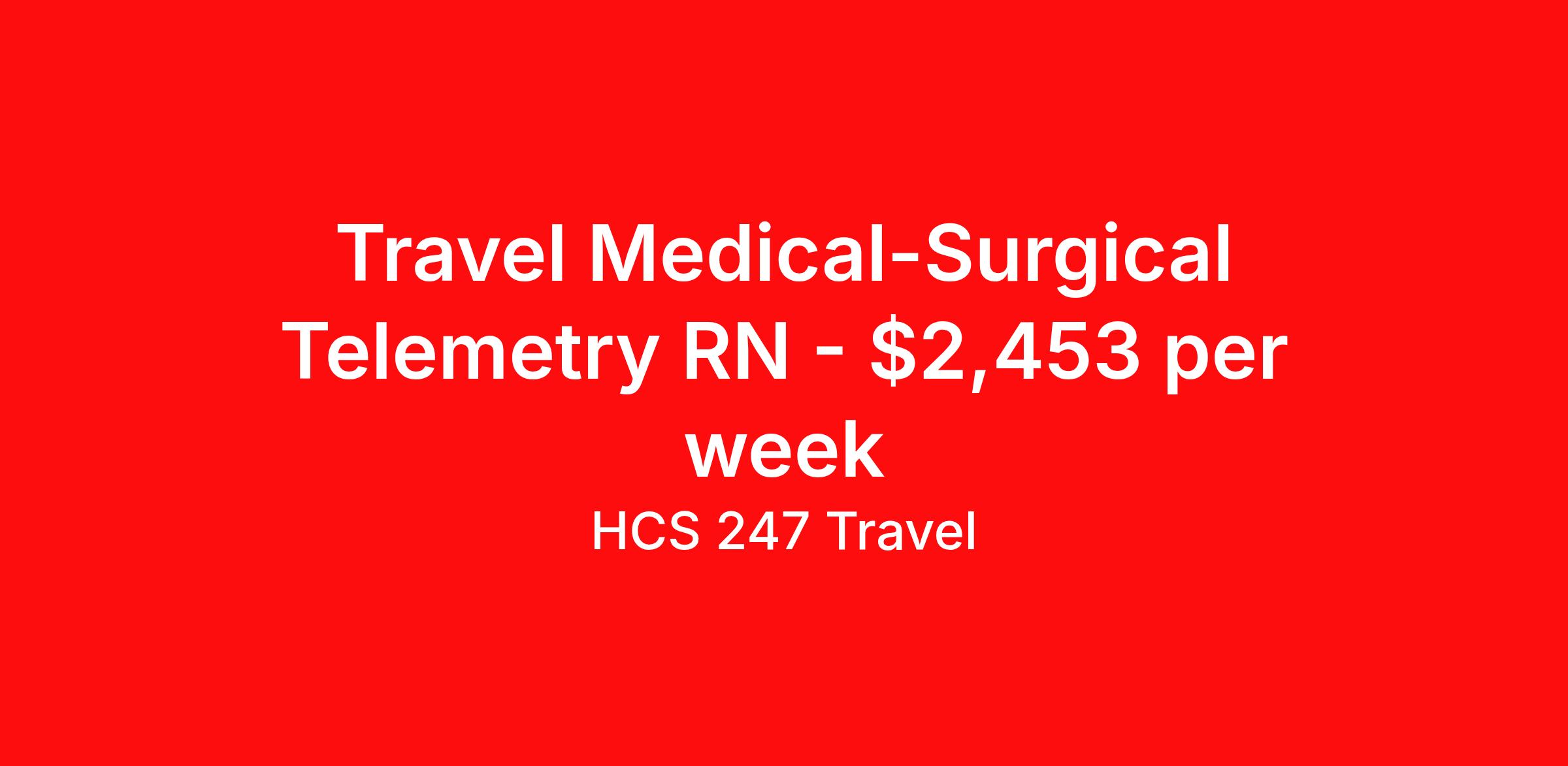 HCS 247 Travel is seeking a travel nurse RN Med Surg / Telemetry for a travel nursing job in Fayetteville, North Carolina. Job Description & Requirements Specialty: Med Surg / Telemetry Discipline: RN Start Date: 04/20/2026 Duration: 13 weeks 48 hours per week Shift: 12 hours, nights Employment Type: Travel HCS 247 Travel Job ID 62473902. Pay package is based on 12 hour shifts and 48 hours per week (subject to confirmation) with tax-free stipend amount to be determined. About HCS 247 Travel HCS 24/7 is a national healthcare staffing organization specializing in the placement of Registered Nurses and Allied health professionals across acute care and other clinical settings. We support travel assignments, local short- and long-term contracts, per diem, temp-to-perm, and direct hire opportunities nationwide. Our clinical coverage includes Registered Nurse specialties such as ER, ICU, Med-Surg, Telemetry, Step-Down, OR, PACU, L&D, Mother/Baby, NICU, Cath Lab, Endoscopy, and more along with a full range of allied and imaging professionals, including Respiratory Therapists, Surgical Technicians, X-Ray Techs, CT Techs, MRI Techs, Interventional Radiology (IR) Techs, Cath Lab Techs, Ultrasound/Sonographers, Mammography Techs, and Nuclear Medicine Techs. With competitive compensation and benefits, consistent opportunities, and a clinician-first approach backed by top-rated customer service, HCS 24/7 delivers a seamless experience from initial application through assignment completion. Benefits Holiday Pay Guaranteed Hours Continuing Education Mileage reimbursement Referral bonus Medical benefits Dental benefits Vision benefits License and certification reimbursement Life insurance Benefits start day 1 Weekly pay