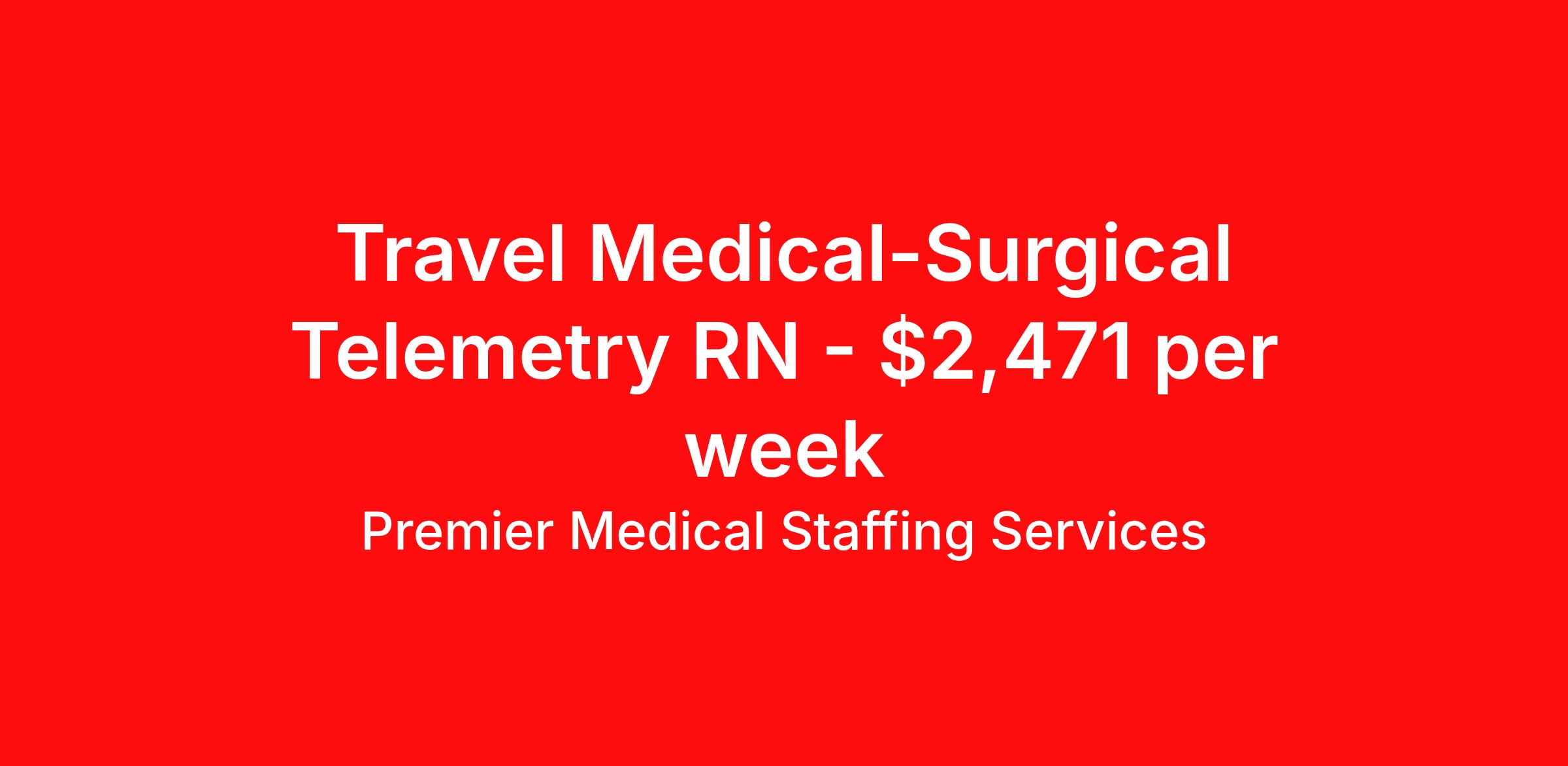 Premier Medical Staffing Services is seeking a travel nurse RN Med Surg / Telemetry for a travel nursing job in Wilmington, North Carolina. Job Description & Requirements Specialty: Med Surg / Telemetry Discipline: RN Start Date: 04/13/2026 Duration: 13 weeks 48 hours per week Shift: 12 hours Employment Type: Travel Premier Medical Staffing Job ID 626652. Pay package is based on 12 hour shifts and 48 hours per week (subject to confirmation) with tax-free stipend amount to be determined. Posted job title: RN Med/Surg About Premier Medical Staffing Services Premier Medical Staffing Services, LLC is a nationally expanding healthcare staffing firm for healthcare professionals and companies. We understand our clients’ need for highly qualified, expertly trained medical professionals and are passionate about helping clinicians find employment opportunities that fit their personality and needs. Able to accommodate the ever-changing needs of the healthcare landscape, we offer per-diem, contract and direct hire placements to support the unique needs of each industry sector. Premier Medical Staffing Services is Joint Commission Certified, a Military Spouse Employment Partner and is certified as a Women’s Business Enterprise. We are proudly nurse owned.