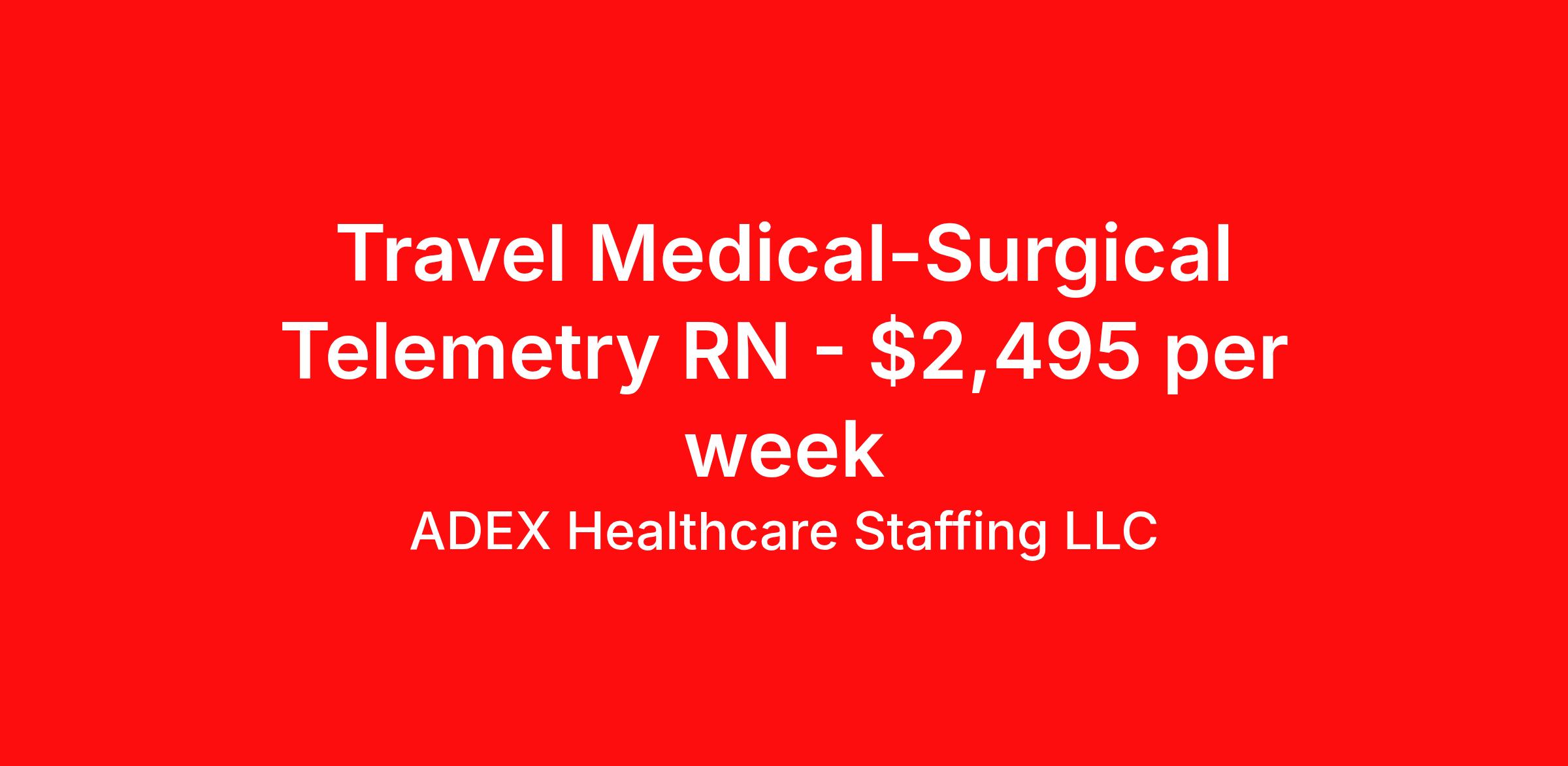 ADEX Healthcare Staffing LLC is seeking a travel nurse RN Med Surg / Telemetry for a travel nursing job in Wilmington, North Carolina. Job Description & Requirements Specialty: Med Surg / Telemetry Discipline: RN Start Date: 04/13/2026 Duration: 13 weeks 48 hours per week Shift: 12 hours, nights Employment Type: Travel RN Position Job Notes: Travel or Local Registered Nurse needed for ASAP start. A minimum of 2 years of recent hospital bedside experience is required. Candidates must be able to start within 5 weeks. Opportunity for extension upon successful completion of the initial assignment. $750 referral bonus available. Opportunity: RN - Med Surg Job Details: • Work 12-hour night shifts with 36 or 48 hours per week accepted • 13-26 week contract duration • Patient ratio of 1:5-6 • Minimum 2 years of nursing experience required • Accepts first-time travelers • Required certifications: BLS • Must pass EKG testing prior to start • 24-hour unit orientation required • Hospital orientation during first week with daily class attendance required • Floating within hospital or to affiliate hospitals required • Weekend requirement: 12-16 shifts per contract • Maximum 7 days RTO allowed • Must work 2 out of 3 major holidays • Fatigue policy: Cannot work more than 5 days in a row or more than 60 hours per week • Dress code: Navy and white scrubs • Must be assigned to Storm Team and/or Hurricane Team • May be required to report during catastrophic events, mass casualties, or disasters • Required skills include telemetry monitoring, IV management, wound care, blood product administration, central line care, chest tube management, isolation precautions • Work with Epic documentation system and Pyxis medication system • Care for patients with diagnoses including diabetes, dementia, COVID, pneumonia, COPD, sepsis, hip fractures, and various medical-surgical conditions • 8-10 hours of non-billable modules must be completed pre-start and annually Facility: This healthcare facility operates a comprehensive medical-surgical unit with 43 beds and a daily census of 39 patients. The facility features an isolation area for COVID patients and provides multi-level care including step-down services. The organization offers extensive interdisciplinary support including IV teams, physical therapy, respiratory services, pharmacy, rapid response teams, and various other specialized services. The facility maintains modern equipment and systems to support high-quality patient care across adult and geriatric populations. Location: Wilmington, NC Wilmington offers a unique blend of coastal living with historic charm, featuring beautiful beaches, a vibrant downtown district, and year-round mild weather. The city provides excellent recreational opportunities including water sports, historic tours, and a thriving arts and culture scene, making it an attractive destination for healthcare professionals seeking both career advancement and lifestyle benefits. Adex Job ID 3237144. Pay package is based on 12 hour shifts and 48 hours per week (subject to confirmation) with tax-free stipend amount to be determined. About ADEX Healthcare Staffing LLC ADEX has been placing healthcare professionals across the US since 2004. Originally founded in Atlanta, GA, the company's headquarters are now located in Tampa, FL. JCAHO certified since 2009. Benefits Referral bonus