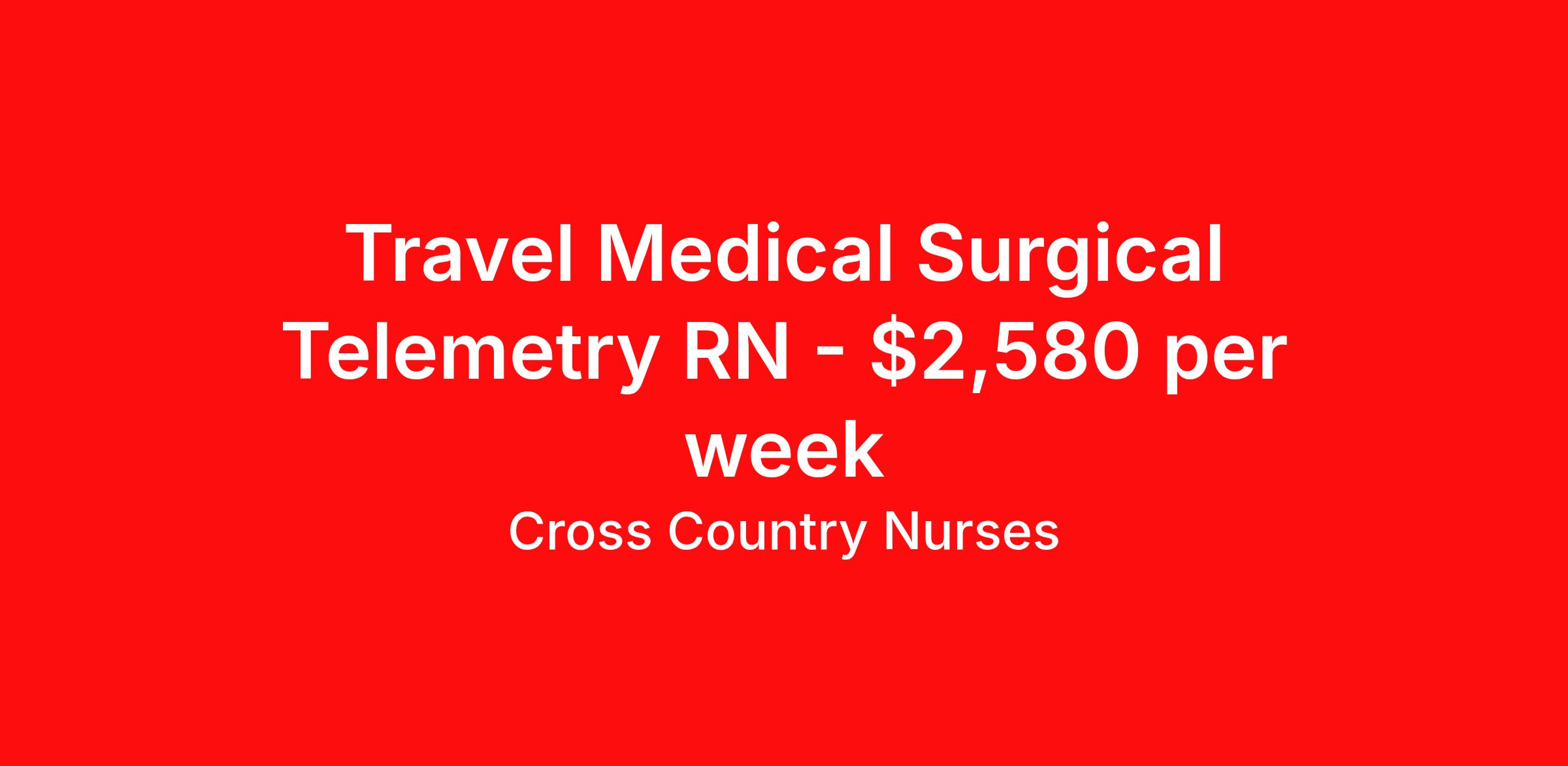 Cross Country Nurses is seeking a travel nurse RN Med Surg / Telemetry for a travel nursing job in Burlington, Vermont. Job Description & Requirements Specialty: Med Surg / Telemetry Discipline: RN Start Date: 04/06/2026 Duration: 13 weeks 36 hours per week Shift: 12 hours, nights Employment Type: Travel Job Description As a medical/surgical telemetry nurse (RN M/S-T), you will extend care to patients who are coping with illness, injury or other medical or surgical circumstances. This includes assessing their condition, using telemetry to monitor blood pressure, heart rhythm, respiration and oxygen saturation, administering medication, changing dressings and documenting information in patient charts. You'll also provide continued support and education to patients, promoting their overall health and ensuring that they have the tools to adequately recuperate and prevent further health issues. Minimum Requirements At least 1 year of recent acute care experience in specialty Active RN license Benefits The benefits of taking a travel nursing job with Cross Country include: Private housing or generous housing allowance Comprehensive health insurance with prescription coverage Dependent health insurance with prescription coverage Competitive salaries Referral bonuses Travel reimbursement 401(k) retirement plan Direct deposit/free checking Unlimited free CE credits Cross Country Job ID 1236649. Pay package is based on 12 hour shifts and 36 hours per week (subject to confirmation) with tax-free stipend amount to be determined. Posted job title: Registered Nurse / Medical Surgical With Telemetry About Cross Country Nurses You care for others — we’re here to care for you. At Cross Country, we know travel nursing is about more than just the job. It’s about building a career that supports your lifestyle, your values, and your impact. We offer competitive pay, full benefits, and 24/7 support from a team that truly understands what it means to be on the front lines. Wherever your journey takes you, we’re with you every step of the way. Let’s build your best life — one assignment at a time. Benefits 401k retirement plan Referral bonus