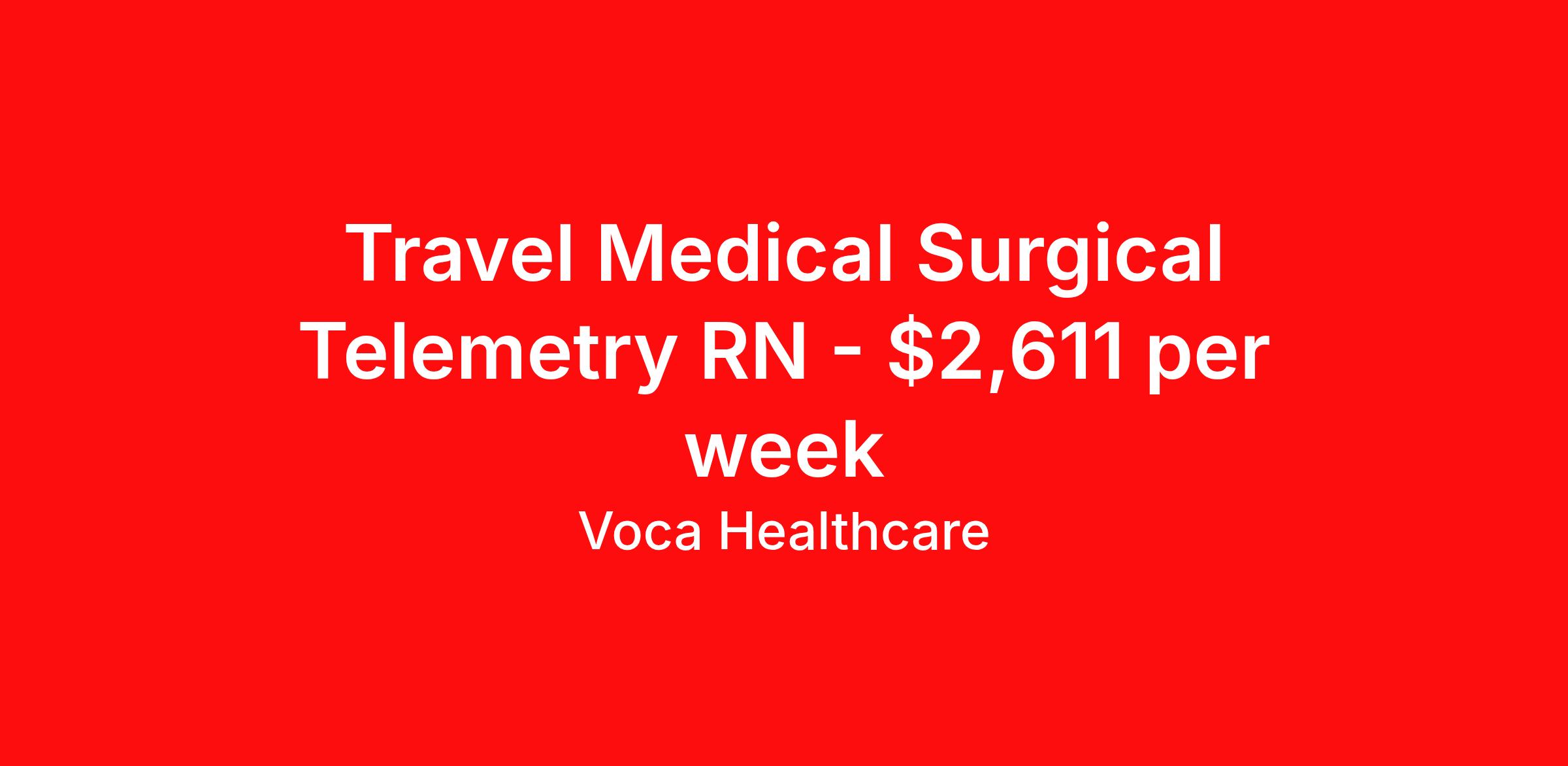 Voca Healthcare is seeking a travel nurse RN Med Surg / Telemetry for a travel nursing job in Morgantown, West Virginia. Job Description & Requirements Specialty: Med Surg / Telemetry Discipline: RN Start Date: 04/06/2026 Duration: 13 weeks 48 hours per week Shift: 12 hours, nights Employment Type: Travel Benefits available on 1st of the month after start: Holiday pay Weekly pay Retention bonus 401k retirement plan Medical benefits Dental benefits Vision benefits Referral bonus Are you an experienced Med Surg RN looking for your next exciting travel assignment, or are you ready to start your travel healthcare career? At Voca, we offer an unmatched experience for healthcare professionals with a travel-first culture that prioritizes your needs and supports your career growth. We understand that every traveler is unique, which is why we provide personalized support from our experienced team of recruiters who are dedicated to matching you with the right assignments. Join Voca today, where you will enjoy a rewarding career and a full suite of benefits designed to ensure your success and well-being. As a Med Surg RN with Voca, you’ll have the opportunity to work in dynamic healthcare settings, gaining valuable experience while receiving competitive compensation and support every step of the way. Qualifications : -Minimum of 2 years of recent experience as a Med Surg RN is preferred, but we are open to exceptional candidates with a strong passion. -Valid certification and/or licensure in the state of practice, if applicable. -Demonstrated ability to maintain a high level of professionalism and composure, especially during stressful and fast-paced moments in the healthcare setting. -Valid Driver’s License and the ability to travel between assignment locations. -Ability to pass a background check and drug screen to meet healthcare industry standards. Why Choose Voca? -Comprehensive Benefits Package: We offer Health, Dental, and Vision Insurance to ensure that you and your loved ones are well taken care of. -Life and Disability Insurance for added peace of mind. -401(k) options to help you save for your future with employer matching. -Certification and Licensure Reimbursement to support your professional development. -Generous Referral Bonus Program – earn rewards for referring your qualified peers to join the Voca team. -Weekly Direct Deposit ensures timely access to your earnings. At Voca, You Are Our Priority : -Travel-First Culture: We understand that travel assignments offer unique challenges, so we ensure a flexible and supportive work environment that focuses on your success. -Personalized Support: Work with a dedicated recruiter who will be your advocate throughout your journey, helping you navigate each assignment and providing personalized guidance to ensure your goals are met. -Strong Relationships: Voca’s culture fosters long-term relationships with our travelers. -We care about your career, your needs, and your future. Whether you're a seasoned Med Surg RN or ready to take the next step in your travel healthcare career, Voca is the perfect place for you to grow, learn, and thrive. Apply today to connect with one of our talented recruiters and begin your next adventure! Apply Now to get started on your next travel assignment with Voca – where your career and well-being come first! Voca Healthcare Job ID 17952070. Pay package is based on 12 hour shifts and 48.0 hours per week (subject to confirmation) with tax-free stipend amount to be determined. Posted job title: RN:Med Surg,19:00:00-07:00:00 About Voca Healthcare As a Voca Traveler, you will gain new clinical skills, visit amazing places and meet awesome healthcare professionals. As a travel health professional, your experience and dedication to patient care is in high demand throughout the United States. Whether you are a veteran traveler looking for your next opportunity, or you are looking to travel for the first time, Voca is here to support you. Voca’s experienced and dedicated travel team works in concert with you every step of the way. Our long-standing partnerships with some of the most respected and recognized healthcare organizations in the country allow us to identify career opportunities to help you increase your knowledge and experience while working with some of the best physicians and healthcare professionals in the world. At Voca, we strongly believe a better career results in a happier you. We are here to help you find a position that is professionally and personally rewarding. Benefits Holiday Pay 401k retirement plan Medical benefits Dental benefits Vision benefits Guaranteed Hours