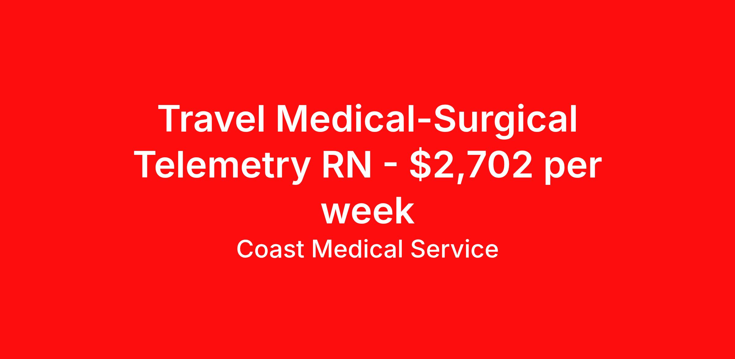 Coast Medical Service is seeking a travel nurse RN Med Surg / Telemetry for a travel nursing job in Macon, Georgia. Job Description & Requirements Specialty: Med Surg / Telemetry Discipline: RN Start Date: 04/06/2026 Duration: 13 weeks 48 hours per week Shift: 12 hours, nights Employment Type: Travel Coast Medical Service is a nationwide travel nursing & allied healthcare staffing agency dedicated to providing an elite traveler experience for the experienced or first-time traveler. Coast is featured on Blue Pipes' 2023 Best Travel Agencies and named a 2022 Top Rated Healthcare Staffing Firm & 2023 First Half Top Rated Healthcare Staffing Firm by Great Recruiters. Please note that pay rate may differ for locally based candidates. Please apply here or contact a recruiter directly to learn more about this position & the facility, and/or explore others that may be of interest to you. We look forward to speaking with you! Coast Medical Services Job ID 36077937. Pay package is based on 12 hour shifts and 48.0 hours per week (subject to confirmation) with tax-free stipend amount to be determined. Posted job title: RN:MS/Tele,19:00:00-07:00:00