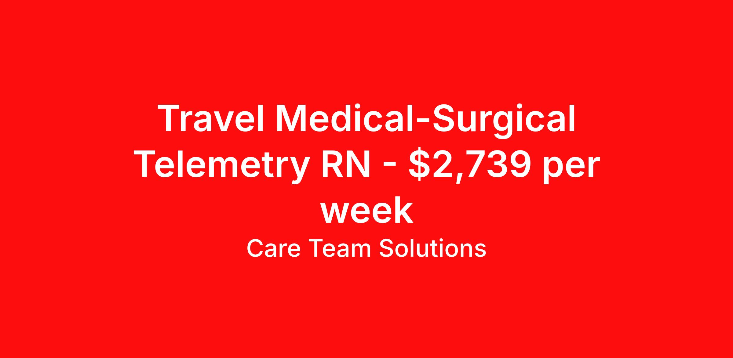 Care Team Solutions is seeking a travel nurse RN Med Surg / Telemetry for a travel nursing job in Rochester, New York. Job Description & Requirements Specialty: Med Surg / Telemetry Discipline: RN Start Date: 04/07/2026 Duration: 13 weeks 48 hours per week Shift: 12 hours Employment Type: Travel Registered Nurse must have 2 years of recent experience in particular specialty Details: Must Have 2 Years of recent Medical/Surgical/Telemetry experience. Specialty: Medical/Surgical/Telemetry Discipline: Registered Nurse Start Date: 2026-04-07 Duration: 13 Weeks Shift: 12 Hours Overnight shift. Hours Per Week: 48 Hours Employment Type: Contract Gross Weekly Pay: $2739.10 Six things that won’t happen if you apply to this job: You won’t have to guess what the downsides are. We’ll tell you up front. You won’t show up on day 1 and find out this is not what you signed up for. We won't leave your phone call ringing when it's inconvenient. Business hours for you are business hours for us. You won’t get shuffled to some customer service rep when a problem pops up. If we screw up something in securing your placement, we'll own it. That means it's on us to make it right. You won’t figure out your credentials alone. Our credentialing experts will walk you through it step by step. We've talked to thousands of travel nurses like you. We know you want good pay. You want to choose when you work. But the one thing nurse after nurse has said they want and don't have is someone in their corner. There's a lot in this business that’s messed up. We’re trying to be the people that fix it. You and every nurse with the guts to travel deserve it. We've worked hard for you to enjoy some one-of-a-kind benefits you'll not likely find anywhere else, because they benefit you more than they benefit us: Our early pay program Student loan reimbursement Free well-being tele-visits with a psychologist Care Team Solutions Job ID 586803. Pay package is based on 12 hour shifts and 48 hours per week (subject to confirmation) with tax-free stipend amount to be determined. Posted job title: MS/Tele Registered Nurse About Care Team Solutions Two brothers who give an enormous damn. We're Justin and Kyle. Neither of us are nurses. It doesn’t take a nurse to see that the way travel nurses are treated sucks. Nursing is already hard enough. Travel nursing takes serious guts. You get the toughest assignments in places you’ve never been. Which can be fun, but it’s also stressful. You’re in your element but outside of your hometown. You can be a stranger on the team. If anyone deserves someone in their corner, it’s you. But that’s not how most agencies operate. Which is why travel nurses hate working with them. We got into this business because we saw bucket-loads of nurses moving through the "churn and burn" travel machinery. We absolutely hate that. You'll do your best work when you have the placements you want and feel fully supported in your work. We pay our people well because we want them to treat you well. Our recruiters are amazing (we picked each of them ourselves), but if you've got a problem too big for them, they can come straight to us. We work like ten feet away. The "Churners and Burners" promise you the same benefits. They might as well copy/paste them from each other. We have them too: 401k, holiday pay, healthcare, dental, travel reimbursement, etc But we've worked hard for you to enjoy some one-of-a-kind benefits you'll not likely find anywhere else, because they benefit you more than they benefit us: Our early pay program Student loan reimbursement Free well-being tele-visits with a psychologist Benefits Weekly pay Holiday Pay Guaranteed Hours 401k retirement plan Wellness and fitness programs Referral bonus Medical benefits Dental benefits Vision benefits School loan reimbursement
