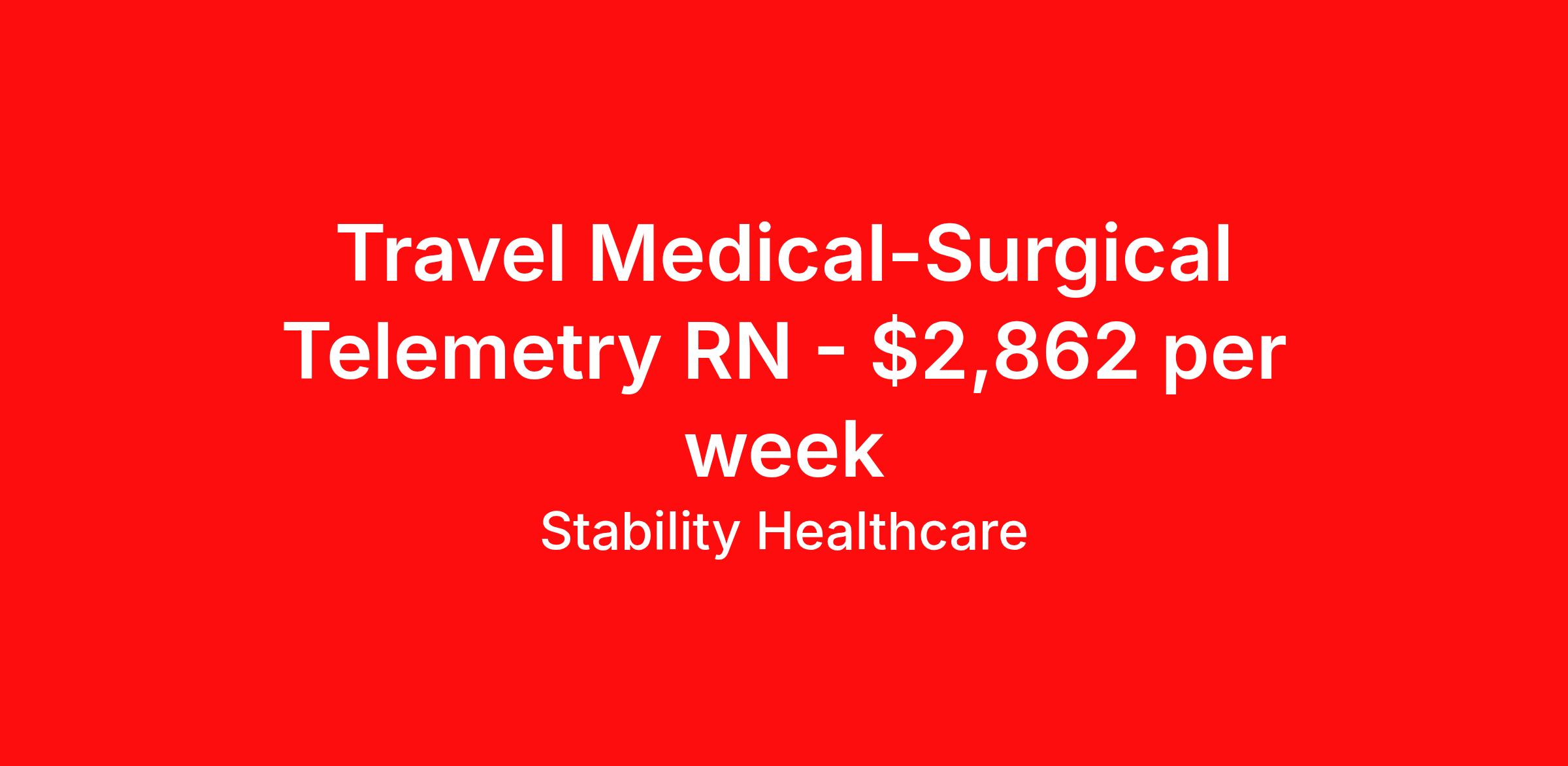 Stability Healthcare is seeking a travel nurse RN Med Surg / Telemetry for a travel nursing job in Rochester, New York. Job Description & Requirements Specialty: Med Surg / Telemetry Discipline: RN Duration: 13 weeks 48 hours per week Shift: 12 hours Employment Type: Travel Stability Healthcare is looking for a Tele Med-Surg RN contract position in Rochester, NY. The Medical Surgical Telemetry Registered Nurse (RN) provides direct nursing care in accordance with established policies, procedures and protocols of the healthcare organization often specializing in Neuro, Ortho or Cardiac patients. *$600 travel bonus *Day 1 health insurance with United Healthcare *PTO plan start accruing on day 1, use during contract or cash out at the end! *Guaranteed stipend if facility calls you off *Extra hour bonus earn an additional hourly bonus for working over your weekly contracted hours Stability Job ID 827683. Pay package is based on 12 hour shifts and 48 hours per week (subject to confirmation) with tax-free stipend amount to be determined. Posted job title: Tele Med-Surg About Stability Healthcare Stability Healthcare was founded in 2009, with the mission of becoming the best Travel Nursing Agency in California. We have been rated one of the top travel nursing agencies and offer our nurses the highest paying travel nursing jobs available. We have access to the best travel assignments from 1000’s of facilities. You can start the year off in sunny California, spend the Spring in the Colorado Rockies, enjoy the Summer in the Mid-West, experience the change of seasons in Boston and New York, and hit the beaches of Florida in the winter. Our Nurses work in the best hospitals and health systems in the country. Benefits Guaranteed Hours Benefits start day 1