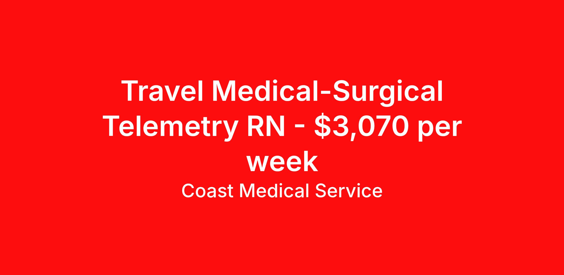 Coast Medical Service is seeking a travel nurse RN Med Surg / Telemetry for a travel nursing job in Rochester, New York. Job Description & Requirements Specialty: Med Surg / Telemetry Discipline: RN Start Date: 04/14/2026 Duration: 16 weeks 48 hours per week Shift: 12 hours, nights Employment Type: Travel Coast Medical Service is a nationwide travel nursing & allied healthcare staffing agency dedicated to providing an elite traveler experience for the experienced or first-time traveler. Coast is featured on Blue Pipes' 2023 Best Travel Agencies and named a 2022 Top Rated Healthcare Staffing Firm & 2023 First Half Top Rated Healthcare Staffing Firm by Great Recruiters. Please note that pay rate may differ for locally based candidates. Please apply here or contact a recruiter directly to learn more about this position & the facility, and/or explore others that may be of interest to you. We look forward to speaking with you! Coast Medical Services Job ID 36078771. Pay package is based on 12 hour shifts and 48.0 hours per week (subject to confirmation) with tax-free stipend amount to be determined. Posted job title: RN:MS/Tele,19:00:00-07:00:00