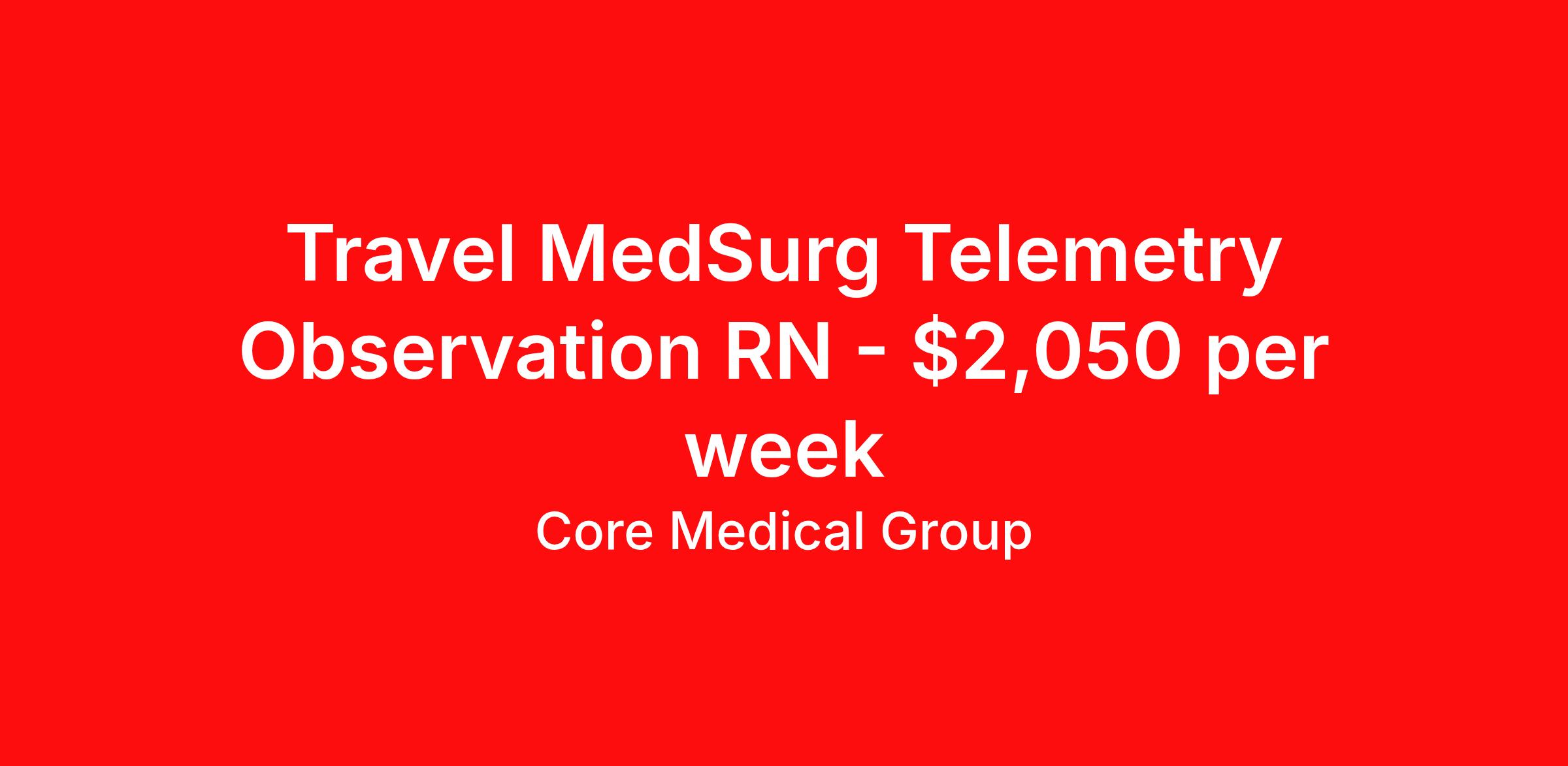 Core Medical Group is seeking a travel nurse RN Med Surg / Telemetry for a travel nursing job in Show Low, Arizona. Job Description & Requirements Specialty: Med Surg / Telemetry Discipline: RN Start Date: 03/20/2026 Duration: 13 weeks 36 hours per week Shift: 12 hours Employment Type: Travel Client in AZ seeking Registered Nurse: Med/Surg-Telemetry for the following shift(s): Nights We are looking for a healthcare professional who is ready to provide exceptional patient care in this contract/travel role. Contract/travel assignments are typically 13 weeks, with potential to extend. Help us continue our mission to connect people, improve lives, and give back to the community by joining the CoreMedical Group team. When you work with CoreMedical Group, we put you first and treat you like family, supporting you every step of the way. CoreMedical Group is one of the largest healthcare staffing agencies in the country, with travel and contract positions located across the United States. Our recruiters will help you find the perfect job, whether it's across the country or across the street. In addition to dedicated, personalized support from your recruiter, when you work with CoreMedical Group you'll receive: Access to an extensive benefits package, including day 1 health, dental, and vision insurance, employer paid life insurance, a health reimbursement account, and more! Weekly paychecks with competitive pay packages Matching 401(k) benefits to help you save for retirement Licensure assistance and reimbursement to set you up for success on your contract Travel reimbursement and dedicated housing support while on assignment Referral cash bonuses when you connect us with other clinicians CoreMedical Group also offers you a free, all-inclusive vacation each year as our way of saying "thank you" for your hard work. Join other healthcare professionals on the annual Club CoreMed retreat and you'll see why our contract and travel professionals come back to us year after year! Your career is too valuable to tackle on your own. Let CoreMedical Group help you with your healthcare journey! *Estimate of weekly payments is intended for informational purposes and includes hourly wages, as well as reimbursements for meal & incidental expenses, and housing expenses incurred on behalf of the Company. Any benefits (medical/dental/vision) are in addition to the weekly pay. Please speak with your Recruiter for additional details. Estimated payments are subject to change until formal offer of assignment is made and accepted. Core Medical Group Job ID 1366391. Pay package is based on 12 hour shifts and 36 hours per week (subject to confirmation) with tax-free stipend amount to be determined. Posted job title: RN About Core Medical Group CoreMedical Group is one of the largest healthcare staffing agencies in the country. We have jobs nationwide in travel nursing, travel allied health, interim, locum tenens, and permanent placements! Join the staffing agency with Club CoreMed, the best perk in the industry - an all inclusive paid trip to a tropical resort! Benefits Weekly pay Holiday Pay Guaranteed Hours Continuing Education 401k retirement plan Pet insurance Company provided housing options Sick pay Wellness and fitness programs Mileage reimbursement Referral bonus Employee assistance programs Medical benefits Dental benefits Vision benefits Benefits start day 1 License and certification reimbursement Life insurance Discount program