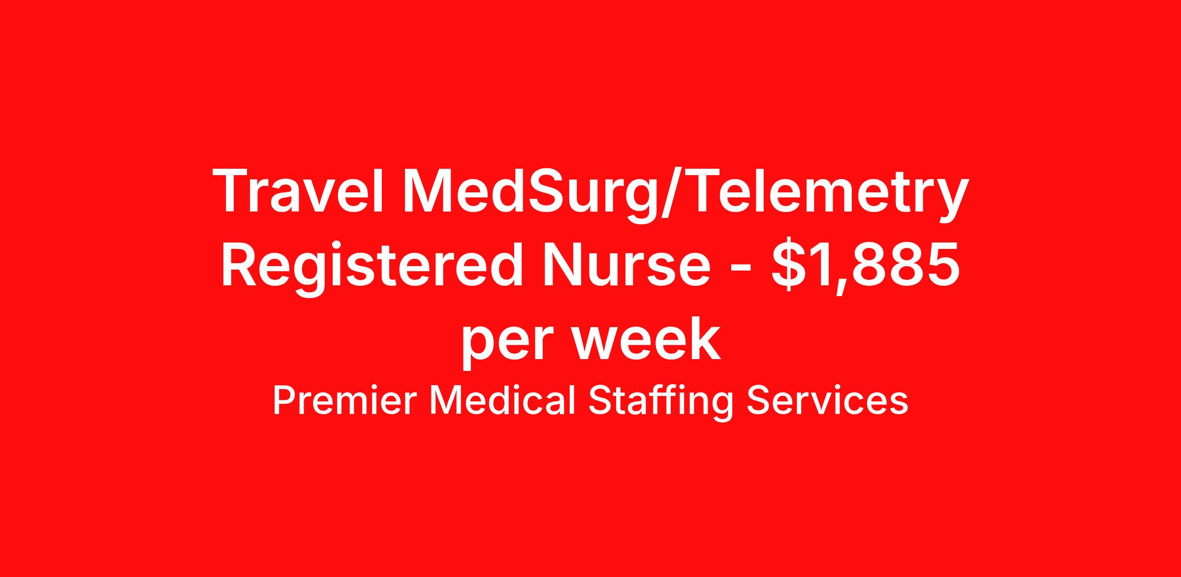 Premier Medical Staffing Services is seeking a travel nurse RN Med Surg / Telemetry for a travel nursing job in Winston-Salem, North Carolina. Job Description & Requirements Specialty: Med Surg / Telemetry Discipline: RN Start Date: 04/06/2026 Duration: 13 weeks 36 hours per week Shift: 12 hours Employment Type: Travel Premier Medical Staffing Job ID 626080. Pay package is based on 12 hour shifts and 36 hours per week (subject to confirmation) with tax-free stipend amount to be determined. Posted job title: RN Tele Med/Surg About Premier Medical Staffing Services Premier Medical Staffing Services, LLC is a nationally expanding healthcare staffing firm for healthcare professionals and companies. We understand our clients’ need for highly qualified, expertly trained medical professionals and are passionate about helping clinicians find employment opportunities that fit their personality and needs. Able to accommodate the ever-changing needs of the healthcare landscape, we offer per-diem, contract and direct hire placements to support the unique needs of each industry sector. Premier Medical Staffing Services is Joint Commission Certified, a Military Spouse Employment Partner and is certified as a Women’s Business Enterprise. We are proudly nurse owned.