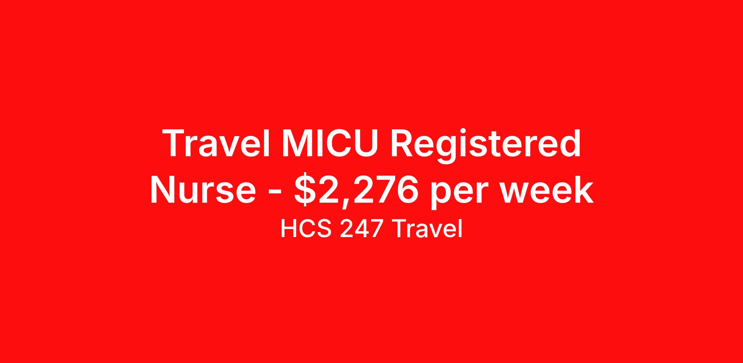 HCS 247 Travel is seeking a travel nurse RN MICU - Medical Intensive Care Unit for a travel nursing job in Albany, Georgia. Job Description & Requirements Specialty: MICU - Medical Intensive Care Unit Discipline: RN Start Date: 03/30/2026 Duration: 17 weeks 36 hours per week Shift: 12 hours, nights Employment Type: Travel HCS 247 Travel Job ID 62375727. Pay package is based on 12 hour shifts and 36 hours per week (subject to confirmation) with tax-free stipend amount to be determined. About HCS 247 Travel HCS 24/7 is a national healthcare staffing organization specializing in the placement of Registered Nurses and Allied health professionals across acute care and other clinical settings. We support travel assignments, local short- and long-term contracts, per diem, temp-to-perm, and direct hire opportunities nationwide. Our clinical coverage includes Registered Nurse specialties such as ER, ICU, Med-Surg, Telemetry, Step-Down, OR, PACU, L&D, Mother/Baby, NICU, Cath Lab, Endoscopy, and more along with a full range of allied and imaging professionals, including Respiratory Therapists, Surgical Technicians, X-Ray Techs, CT Techs, MRI Techs, Interventional Radiology (IR) Techs, Cath Lab Techs, Ultrasound/Sonographers, Mammography Techs, and Nuclear Medicine Techs. With competitive compensation and benefits, consistent opportunities, and a clinician-first approach backed by top-rated customer service, HCS 24/7 delivers a seamless experience from initial application through assignment completion. Benefits Holiday Pay Guaranteed Hours Continuing Education Mileage reimbursement Referral bonus Medical benefits Dental benefits Vision benefits License and certification reimbursement Life insurance Benefits start day 1 Weekly pay
