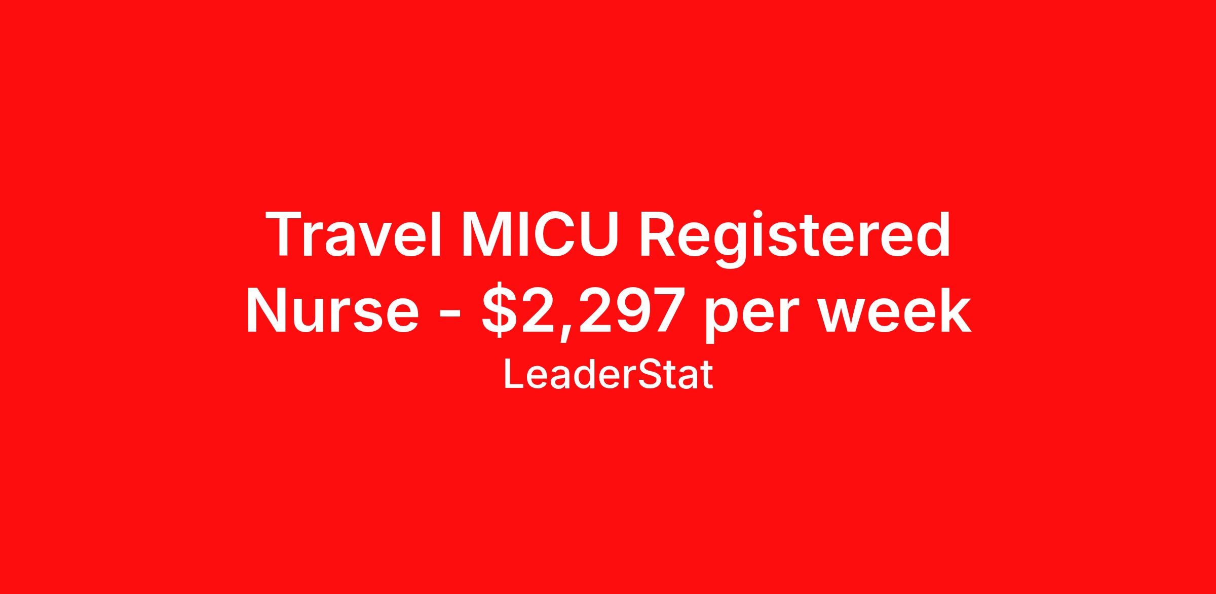 LeaderStat is seeking a travel nurse RN MICU - Medical Intensive Care Unit for a travel nursing job in Albany, Georgia. Job Description & Requirements Specialty: MICU - Medical Intensive Care Unit Discipline: RN Start Date: 03/30/2026 Duration: 17 weeks 36 hours per week Shift: 12 hours Employment Type: Travel Estimated Pay Package : Up to $ 2296.84 per week *The above pay package is an estimate, please contact our team to put together your personalized pay package, as a variety of factors can influence your total pay.* Registered Nurse - RN MICU | Registered Nurse - RN in Albany, GA LeaderStat is currently seeking a Registered Nurse - RN with MICU | Registered Nurse - RN experience for a(n) 17 week contract in GA. Start Date: 3/30/2026 End Date: 7/27/2026 Shift: Nights Minimum of 18 months experience working as a full-time Registered Nurse Clinical experience within the last 2 years Current State Licensure Current Relevant Certifications (BLS, ACLS, etc) The LeaderStat Difference At LeaderStat, our recruiters are true experts in Travel Nursing. We go above and beyond to match each candidate with the best travel nurse opportunities available. But our commitment doesn’t stop at placement. We’re here to ensure your success every step of the way, providing continuous support throughout your entire contract—from start to finish! Our goal is to find the perfect travel nurse assignments that align with your unique needs and career goals. While you focus on delivering exceptional care to your patients, we’ll take care of everything else, allowing you to thrive in your role. LeaderStat Perks & Benefits As a Traveling Nurse with LeaderStat you receive excellent benefits: Weekly Pay & Direct Deposit W2 Employee Status 401(k) Retirement Plan Medical, Dental and Vision Insurance Referral Bonuses Dedicated Support Team To learn more about LeaderStat visit www.leaderstat.com/travel-nursing Equal Employment Opportunity: LeaderStat, Ltd. prohibits discrimination with respect to the hiring or promotion of individuals, conditions of employment, disciplinary and discharge practices or any other aspect of employment on the basis of sex, race, color, age, national origin, religion, disability, marital status, sexual orientation, gender identity, pregnancy or veteran status. LeaderStat Job ID 295765. Pay package is based on 12 hour shifts and 36 hours per week (subject to confirmation) with tax-free stipend amount to be determined. Posted job title: Medical Intensive Care Unit - Registered Nurse About LeaderStat LeaderStat is a National staffing, recruiting, and consulting firm dedicated to the healthcare industry. For 20 years, LeaderStat has been dedicated to partnering with exceptional healthcare providers to find them the very best assignments throughout the country. Specializing in Travel Nursing, Interim Leadership, Executive Search, and Consulting. When you work with the LeaderStat team, you work with a recruiter who is dedicated to finding you the perfect assignment. Why would you settle for less? Benefits Referral bonus License and certification reimbursement Medical benefits Holiday Pay Weekly pay 401k retirement plan