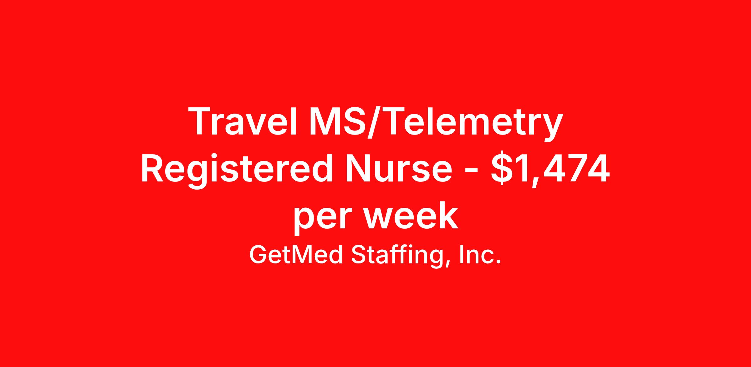 GetMed Staffing, Inc. is seeking a travel nurse RN Telemetry Med Surg for a travel nursing job in Orangeburg, South Carolina. Job Description & Requirements Specialty: Telemetry Discipline: RN Start Date: 04/07/2026 Duration: 13 weeks 36 hours per week Shift: 12 hours, nights Employment Type: Travel GetMed Staffing is searching for a strong Telemetry RN to assist our traveler-friendly client. A minimum of 1-2 years of experience is required. Traveling with GetMed Staffing offers the unique opportunity to gain diverse experiences, both personally and professionally. Gain experience that matters. GetMed Staffing, Inc. Job ID 35803125. Pay package is based on 12 hour shifts and 36.0 hours per week (subject to confirmation) with tax-free stipend amount to be determined. Posted job title: RN:Telemetry,19:00:00-07:00:00 About GetMed Staffing, Inc. We are a diversity owned company, specializing in healthcare recruiting services. We truly understand how important a healthcare travelers' relationship is with their recruiter, as well as our relationship is with our healthcare facilities. We recognize that the needs of our healthcare travelers can vary, and therefore we provide the personalized touch necessary to ensure a successful travel assignment each and every time. Our healthcare facilities and clients benefit from us putting our healthcare travelers first. GetMed Staffing is excited to be a leader within the industry by focusing on providing healthcare travelers with more choices and possibilities as they plan for their next healthcare travel assignment. Benefits Life insurance Medical benefits Dental benefits Vision benefits 401k retirement plan