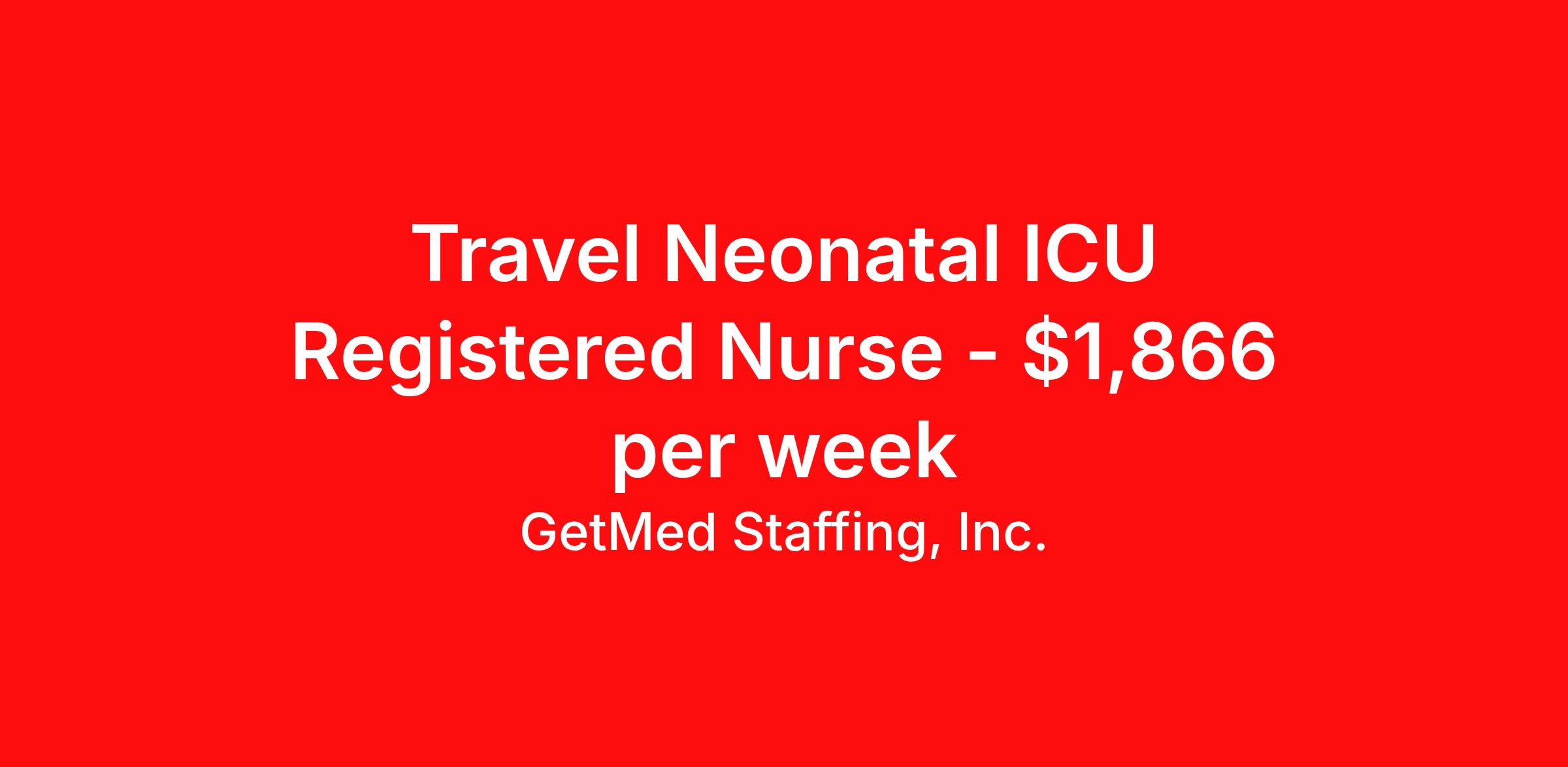 GetMed Staffing, Inc. is seeking a travel nurse RN NICU - Neonatal Intensive Care for a travel nursing job in New Lenox, Illinois. Job Description & Requirements Specialty: NICU - Neonatal Intensive Care Discipline: RN Start Date: 04/06/2026 Duration: 13 weeks 36 hours per week Shift: 12 hours, nights Employment Type: Travel GetMed Staffing is searching for a strong NICU RN to assist our traveler-friendly client. A minimum of 1-2 years of experience is required. Traveling with GetMed Staffing offers the unique opportunity to gain diverse experiences, both personally and professionally. Gain experience that matters. GetMed Staffing, Inc. Job ID 36100608. Pay package is based on 12 hour shifts and 36.0 hours per week (subject to confirmation) with tax-free stipend amount to be determined. Posted job title: RN:NICU,19:00:00-07:00:00 About GetMed Staffing, Inc. We are a diversity owned company, specializing in healthcare recruiting services. We truly understand how important a healthcare travelers' relationship is with their recruiter, as well as our relationship is with our healthcare facilities. We recognize that the needs of our healthcare travelers can vary, and therefore we provide the personalized touch necessary to ensure a successful travel assignment each and every time. Our healthcare facilities and clients benefit from us putting our healthcare travelers first. GetMed Staffing is excited to be a leader within the industry by focusing on providing healthcare travelers with more choices and possibilities as they plan for their next healthcare travel assignment. Benefits Life insurance Medical benefits Dental benefits Vision benefits 401k retirement plan