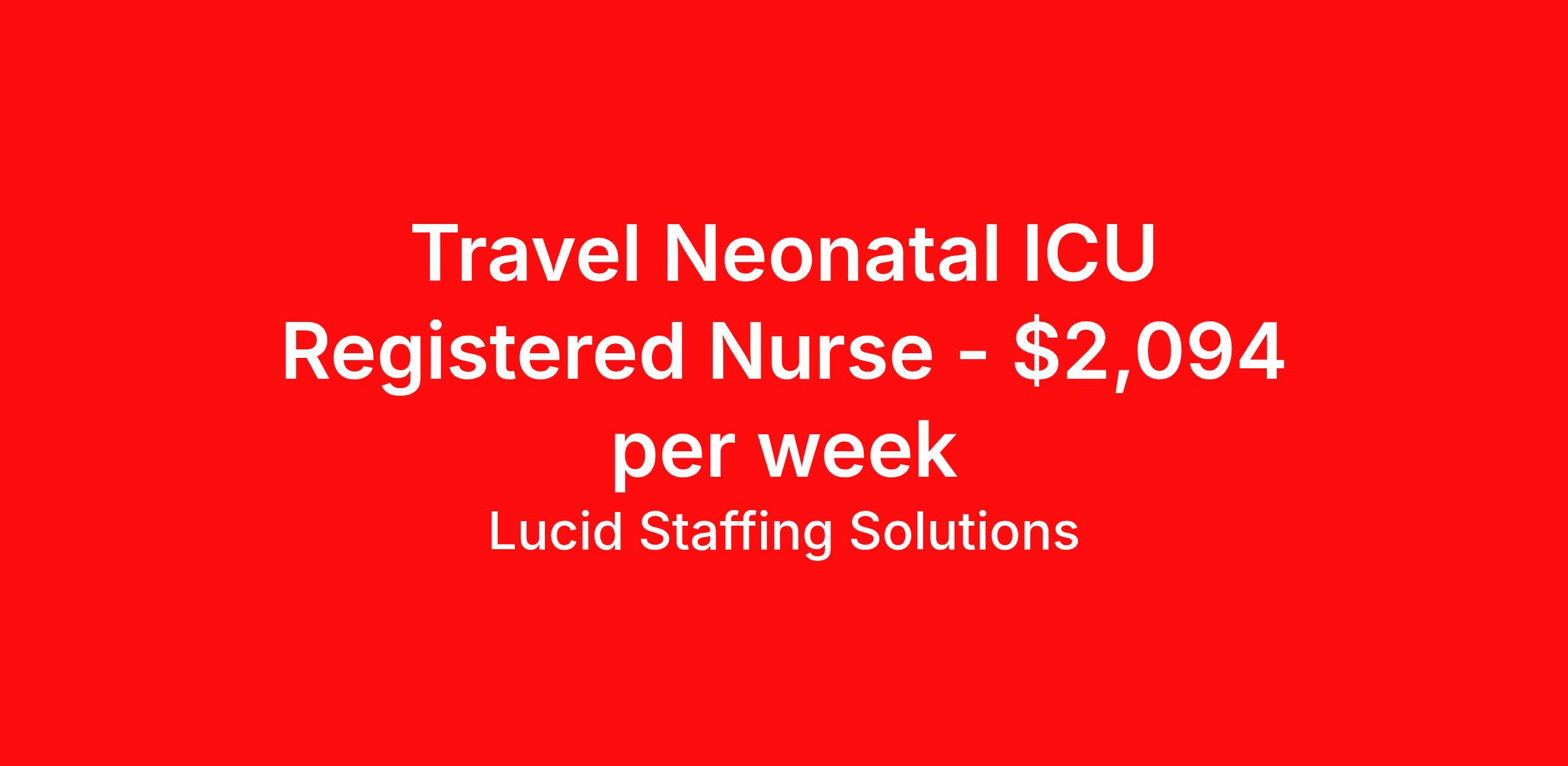 Lucid Staffing Solutions is seeking a travel nurse RN NICU - Neonatal Intensive Care for a travel nursing job in New Lenox, Illinois. Job Description & Requirements Specialty: NICU - Neonatal Intensive Care Discipline: RN Duration: 13 weeks 36 hours per week Shift: 12 hours, days Employment Type: Travel Job Description Position: Travel Registered Dietician (RD) with experience in Neonatal Location: New Lenox, Illinois Shift: hr Day Weekly Gross: $2093.60 Lucid Staffing Solutions was created by former healthcare workers who lived the short staffing, the chaotic workflows, and the nonstop pressure that comes with patient care. We built an agency powered by real clinical experience, kept simple and supportive, so you never have to guess whether the people guiding you actually know what they’re talking about. Minimum Requirements: Active license as a Registered Dietician (RD) Licensed in Illinois (If applicable) or compact eligible Two years of recent Neonatal experience Active BLS Why Lucid Works for Travelers Paid Weekly: Stipends pushed to GSA limits whenever possible $500 Travel Reimbursement: Paid at the start of each assignment Clinician-Led Team: Recruiters and Account Managers with real clinical experience In-House Compliance: fast updates, real communication, and none of the delays that come with outsourced vendors. Health Coverage Options: Multiple medical plans plus dental, vision, and workers compensation 401(k) Match: 4 percent match after 6 months License & Certification Reimbursement: We help cover the cost of staying compliant Liability Insurance: Included automatically Referral Bonuses: $500 per referral, $750 after five referrals Ready to start your journey? Apply today to connect with a Clinician-Recruiter! Lucid Staffing Solutions Job ID 37308. Pay package is based on 12 hour shifts and 36 hours per week (subject to confirmation) with tax-free stipend amount to be determined. Posted job title: Neonatal About Lucid Staffing Solutions Clinician Owned & Operated At Lucid Staffing Solutions, we do things differently—because we’ve been in your shoes. Founded by actual healthcare professionals, Lucid was built to fix the issues we experienced as travelers. We know what makes a great assignment: competitive pay, seamless onboarding, honest recruiters, and most importantly—working with a team that truly sees and supports you. Our entire team is made up of former clinicians who understand the demands of the job and what travelers truly need to succeed. We offer some of the highest paying allied health and nursing contracts across the country, along with some amazing benefits & perks. Whether you're chasing freedom, flexible schedules, bigger paychecks, or your next adventure, Lucid helps you get there—with real support, real respect , and real healthcare experts. Benefits Dental benefits Medical benefits Vision benefits