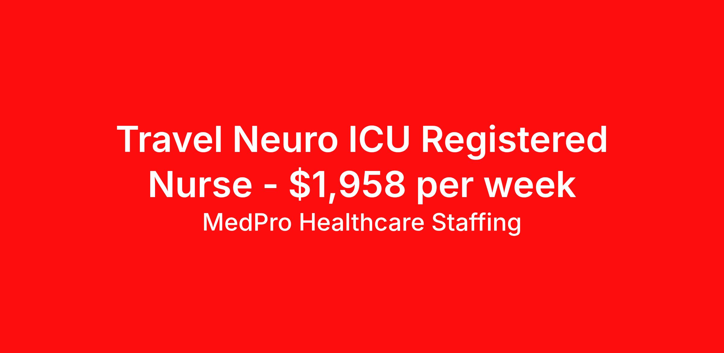 MedPro Healthcare Staffing is seeking a travel nurse RN Neuro ICU for a travel nursing job in Asheville, North Carolina. Job Description & Requirements Specialty: Neuro ICU Discipline: RN Start Date: 04/06/2026 Duration: 13 weeks 36 hours per week Shift: 12 hours, nights Employment Type: Travel MedPro Healthcare Staffing , a Joint Commission-certified staffing agency, is seeking a quality ICU/CCU Registered Nurse for a travel assignment with one of our top healthcare clients. Requirements Active RN License Degree from accredited nursing program BLS & ACLS Certification Eighteen months of recent experience in an Acute Care ICU setting Other requirements to be determined by our client facility Benefits Weekly pay and direct deposit Full coverage of all credentialing fees Private housing or housing allowance Group Health insurance for you and your family Company-paid life and disability insurance Travel reimbursement 401(k) matching Unlimited Referral Bonuses up to $1,000 Duties Responsibilities ICU/Critical Care Nurse (RN) possesses the skills needed to manage the care of adult patients experiencing life-threatening problems requiring complex assessment, high intensity therapies, and interventions. Provide patient care as well as education and support to the patient's family. Ensure proper functioning of life support equipment such as ventilators and feeding tubes. Observe the patient's heart rate, blood pressure and respiration for signs of distress. Administer medication, IVs, and insert catheters as needed. Meticulous documentation of medication administration. Assist in emergency nursing procedures necessary for prompt control of changes in patient’s physical condition. Perform cardiopulmonary resuscitation accurately and effectively. About Agency MedPro Healthcare Staffing is a Joint Commission certified provider of contract staffing services. Since 1983, we have placed nursing and allied travelers in top healthcare facilities nationwide. Join us today for your very own MedPro Experience®. If qualified and interested, please call for immediate consideration. MedPro Staffing is an Equal Opportunity Employer. All applicants will be considered for employment without attention to race, color, religion, national origin, age, sex, disability, marital status or veteran status. Key Words: Intensive Care Unit, Nurse, Registered Nurse, RN-ICU, Critical Care Unit, Critical Care Nurse, Intensive Care Nurse, RN-CCU, Travel Nurse, Agency Nurse, Contract Nurse, Travel Contract, ACLS, EKG, RN, Registered Nurse, ICU, CCU, RN-ICU, RN-CCU, MICU, SICU, Advanced Life Support, CPR, BLS, Travel Nursing *Weekly payment estimates are intended for informational purposes only and include a gross estimate of hourly wages and reimbursements for meal, incidental, and housing expenses. Your recruiter will confirm your eligibility and provide additional details. MedPro Job ID a0Fcx00000EyYbREAV. Pay package is based on 12 hour shifts and 36 hours per week (subject to confirmation) with tax-free stipend amount to be determined. Posted job title: ICU/CCU Registered Nurse Nursing: ICU - Intensive Care. About MedPro Healthcare Staffing At MedPro Healthcare Staffing , we believe no one cares more for caregivers than we do. Our mission is simple: you focus on your patients, and we’ll take care of the rest. As a Joint Commission-certified leader in temporary and contract healthcare staffing since 1983, MedPro has proudly connected nursing and allied travelers with top healthcare facilities across the nation. With thousands of job opportunities available nationwide, we make it easy to find assignments that align with your goals and lifestyle. Our on-staff clinical support team—alongside a compassionate group of experienced recruiters—provides hands-on guidance every step of the way. From Day 1 medical benefits and a 401(k) plan to personalized career support, we’re committed to ensuring every professional we serve feels valued, cared for, and empowered to succeed. Guided by a CEO who is a Registered Nurse, MedPro is built on a foundation of clinical insight and genuine compassion for the caregiving community. Through The MedPro Experience® , we deliver travel assignments that are rewarding, memorable, and designed to help you DREAM big, EXPLORE often, and ACHIEVE greatness. Benefits Day 1 medical, dental, and vision benefits for you and your family Weekly pay and direct deposit Unlimited Referral Bonuses starting at $500 On Staff Clinical Support Team Access to nationwide travel assignments MPX Mobile app -24/7 real-time access to jobs, credentials, assignment details, and more Full coverage of all credentialing fees Private housing or housing allowance Tax Free Per Diems, Housing Stipends and Travel Reimbursements Company-paid life and disability insurance Travel reimbursement 401(k) matching Benefits Weekly pay Referral bonus Employee assistance programs