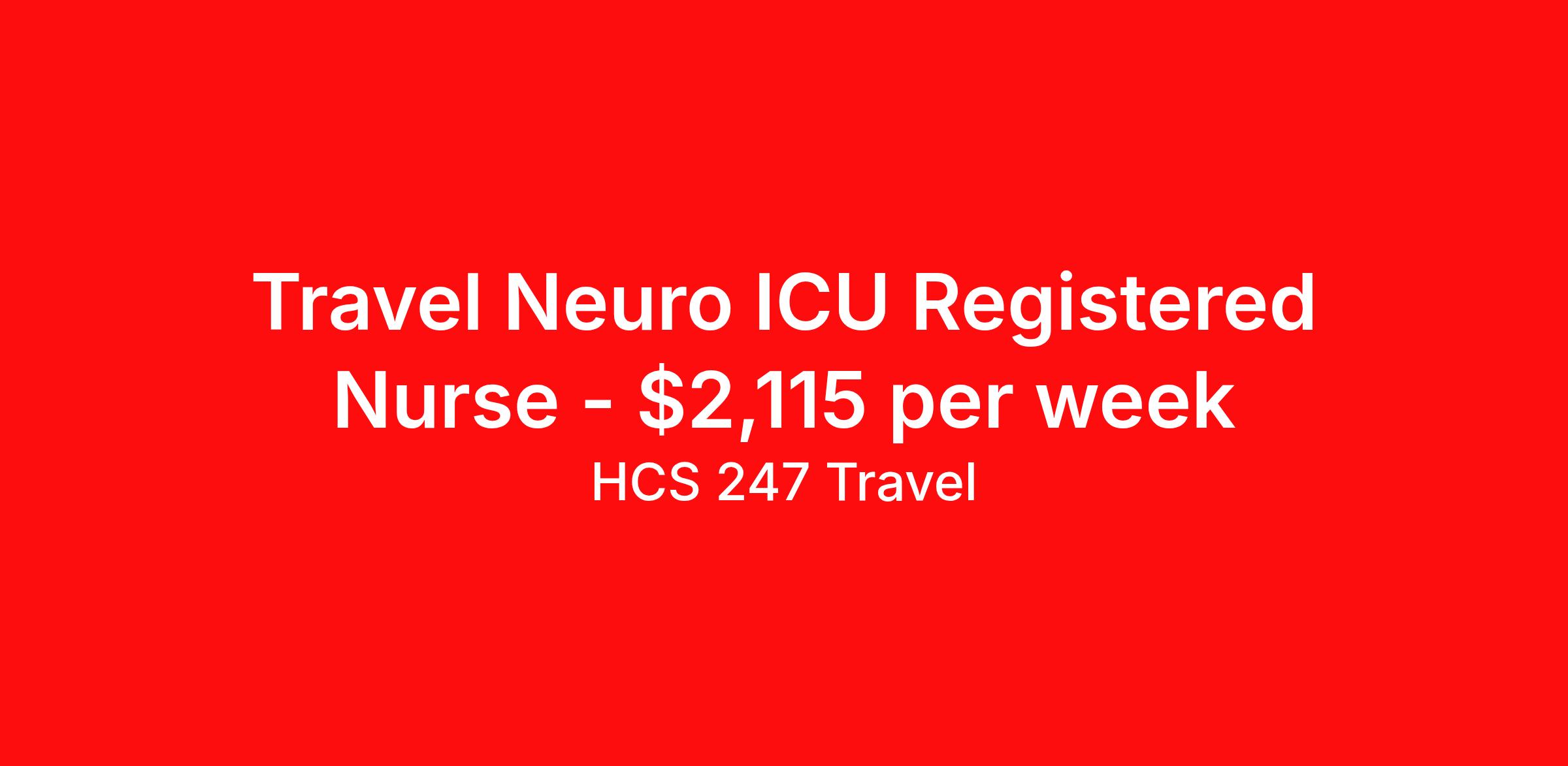 HCS 247 Travel is seeking a travel nurse RN Neuro ICU for a travel nursing job in Asheville, North Carolina. Job Description & Requirements Specialty: Neuro ICU Discipline: RN Start Date: 04/06/2026 Duration: 26 weeks 36 hours per week Shift: 12 hours, nights Employment Type: Travel HCS 247 Travel Job ID 61193444. Pay package is based on 12 hour shifts and 36 hours per week (subject to confirmation) with tax-free stipend amount to be determined. About HCS 247 Travel HCS 24/7 is a national healthcare staffing organization specializing in the placement of Registered Nurses and Allied health professionals across acute care and other clinical settings. We support travel assignments, local short- and long-term contracts, per diem, temp-to-perm, and direct hire opportunities nationwide. Our clinical coverage includes Registered Nurse specialties such as ER, ICU, Med-Surg, Telemetry, Step-Down, OR, PACU, L&D, Mother/Baby, NICU, Cath Lab, Endoscopy, and more along with a full range of allied and imaging professionals, including Respiratory Therapists, Surgical Technicians, X-Ray Techs, CT Techs, MRI Techs, Interventional Radiology (IR) Techs, Cath Lab Techs, Ultrasound/Sonographers, Mammography Techs, and Nuclear Medicine Techs. With competitive compensation and benefits, consistent opportunities, and a clinician-first approach backed by top-rated customer service, HCS 24/7 delivers a seamless experience from initial application through assignment completion. Benefits Holiday Pay Guaranteed Hours Continuing Education Mileage reimbursement Referral bonus Medical benefits Dental benefits Vision benefits License and certification reimbursement Life insurance Benefits start day 1 Weekly pay