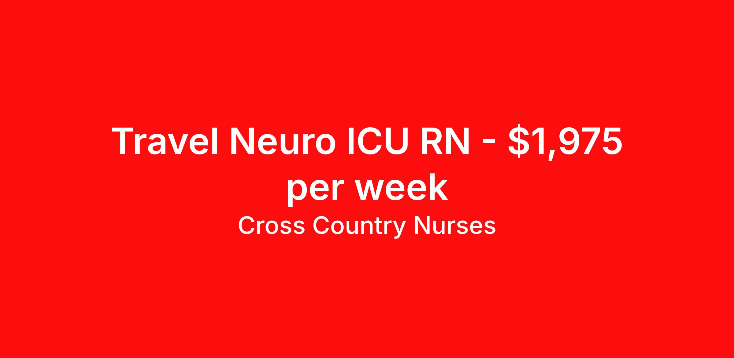 Cross Country Nurses is seeking a travel nurse RN Neuro ICU for a travel nursing job in Indianapolis, Indiana. Job Description & Requirements Specialty: Neuro ICU Discipline: RN Start Date: 04/06/2026 Duration: 13 weeks 36 hours per week Shift: 12 hours, nights Employment Type: Travel Job Description As a registered nurse (RN), you will provide care for patients dealing with illness or injury. Depending on your role, you'll work at a hospital, outpatient center, private practice, home health, telemedicine, nursing facility, clinic or other facility. You'll perform tasks like assessing patients, developing care plans, administering medication, providing treatment, assisting with surgery, changing bandages, monitoring vitals and maintaining records. You'll also provide continued support and education to patients, promoting their overall health and ensuring they have the tools to recover and prevent further health issues. Minimum Requirements At least 1 year of recent acute care experience in specialty Active RN license Benefits The benefits of taking a travel nursing job with Cross Country include: Private housing or generous housing allowance Comprehensive health insurance with prescription coverage Dependent health insurance with prescription coverage Competitive salaries Referral bonuses Travel reimbursement 401(k) retirement plan Direct deposit/free checking Unlimited free CE credits Cross Country Job ID 1232376. Pay package is based on 12 hour shifts and 36 hours per week (subject to confirmation) with tax-free stipend amount to be determined. Posted job title: Registered Nurse / Intensive Care Unit Neurological About Cross Country Nurses You care for others — we’re here to care for you. At Cross Country, we know travel nursing is about more than just the job. It’s about building a career that supports your lifestyle, your values, and your impact. We offer competitive pay, full benefits, and 24/7 support from a team that truly understands what it means to be on the front lines. Wherever your journey takes you, we’re with you every step of the way. Let’s build your best life — one assignment at a time. Benefits 401k retirement plan Referral bonus