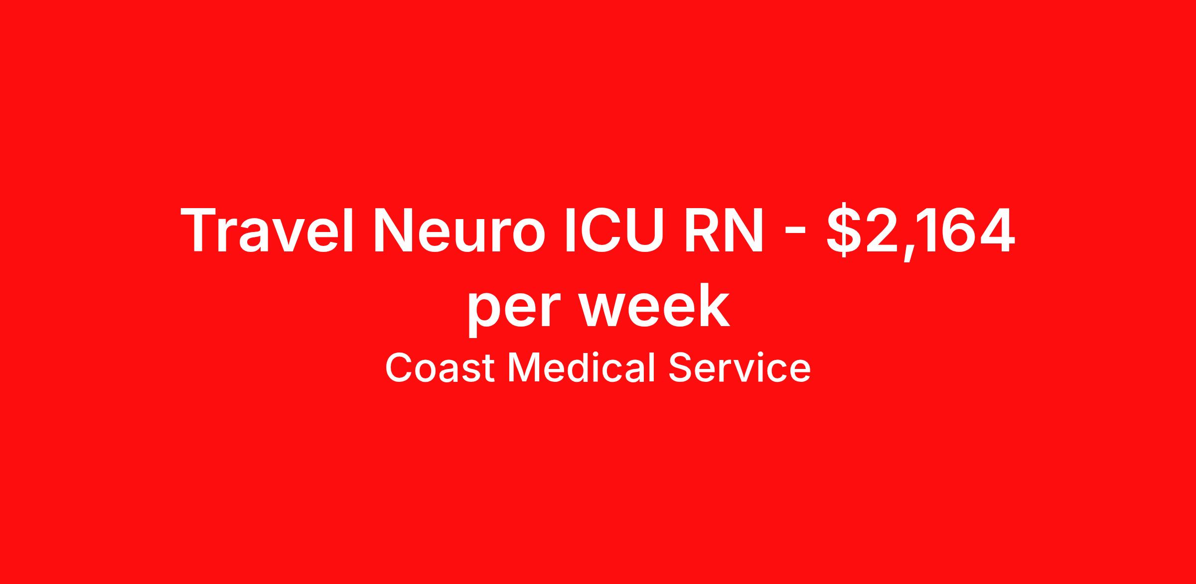 Coast Medical Service is seeking a travel nurse RN Neuro ICU for a travel nursing job in Newburgh, Indiana. Job Description & Requirements Specialty: Neuro ICU Discipline: RN Start Date: 04/06/2026 Duration: 13 weeks 36 hours per week Shift: 12 hours, nights Employment Type: Travel Coast Medical Service is a nationwide travel nursing & allied healthcare staffing agency dedicated to providing an elite traveler experience for the experienced or first-time traveler. Coast is featured on Blue Pipes' 2023 Best Travel Agencies and named a 2022 Top Rated Healthcare Staffing Firm & 2023 First Half Top Rated Healthcare Staffing Firm by Great Recruiters. Please note that pay rate may differ for locally based candidates. Please apply here or contact a recruiter directly to learn more about this position & the facility, and/or explore others that may be of interest to you. We look forward to speaking with you! Coast Medical Services Job ID 36142485. Pay package is based on 12 hour shifts and 36.0 hours per week (subject to confirmation) with tax-free stipend amount to be determined. Posted job title: RN:Neuro Intensive Care Unit,19:00:00-07:30:00