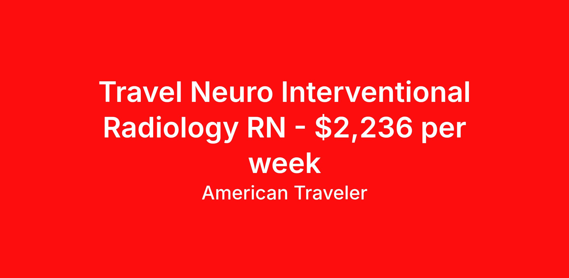 American Traveler is seeking a travel nurse RN Interventional Radiology for a travel nursing job in Corpus Christi, Texas. Job Description & Requirements Specialty: Interventional Radiology Discipline: RN Start Date: ASAP Duration: 13 weeks 36 hours per week Shift: 12 hours, days Employment Type: Travel Assignment Overview Shift: Days, 3x12hrs Hours: 36 hrs/wk Start Date: Sep 1, 2025 Length: 13 weeks Openings: 1 Description American Traveler is seeking a Special Procedures Tech for a Neuro Interventional Radiology assignment with 12-hour day shifts and recent specialty experience. Details Work in the Neuro Interventional Radiology unit Day shifts from 7:00 AM to 7:00 PM 13-week contract assignment Care for neurological interventional radiology patients Requirements Active RN license required Minimum 1 year of recent experience in Neuro Interventional Radiology No gaps in work history of 90 days or more in the past 12 months Must provide US Social Security Number and date of birth for consideration Additional Information Assignment requires working with a neuro interventional team All certifications must be through AHA or ARC and valid for the assignment duration American Traveler Job ID P-601387. Pay package is based on 12 hour shifts and 36 hours per week (subject to confirmation) with tax-free stipend amount to be determined. Posted job title: Travel Interventional Radiology Technologist - Special Procedures About American Traveler With over 25 years of experience, American Traveler has established a reputation for outstanding customer service. Our team ensures a smooth, worry-free experience for those starting on or expanding their travel nursing and allied careers. With thousands of travel nursing and allied jobs nationwide, our attentive and approachable recruiters find positions that align perfectly with your career aspirations and personal requirements. American Traveler offers exceptional benefits, including premium medical, dental, vision and life insurance beginning day one of your assignment, generous 401(k) match, substantial housing stipends, and more. Additionally, with 24/7 support and access to our in-house clinicians, you are assured confidence and comfort throughout your assignment. With our team behind you, you can relax and enjoy a rewarding travel career.