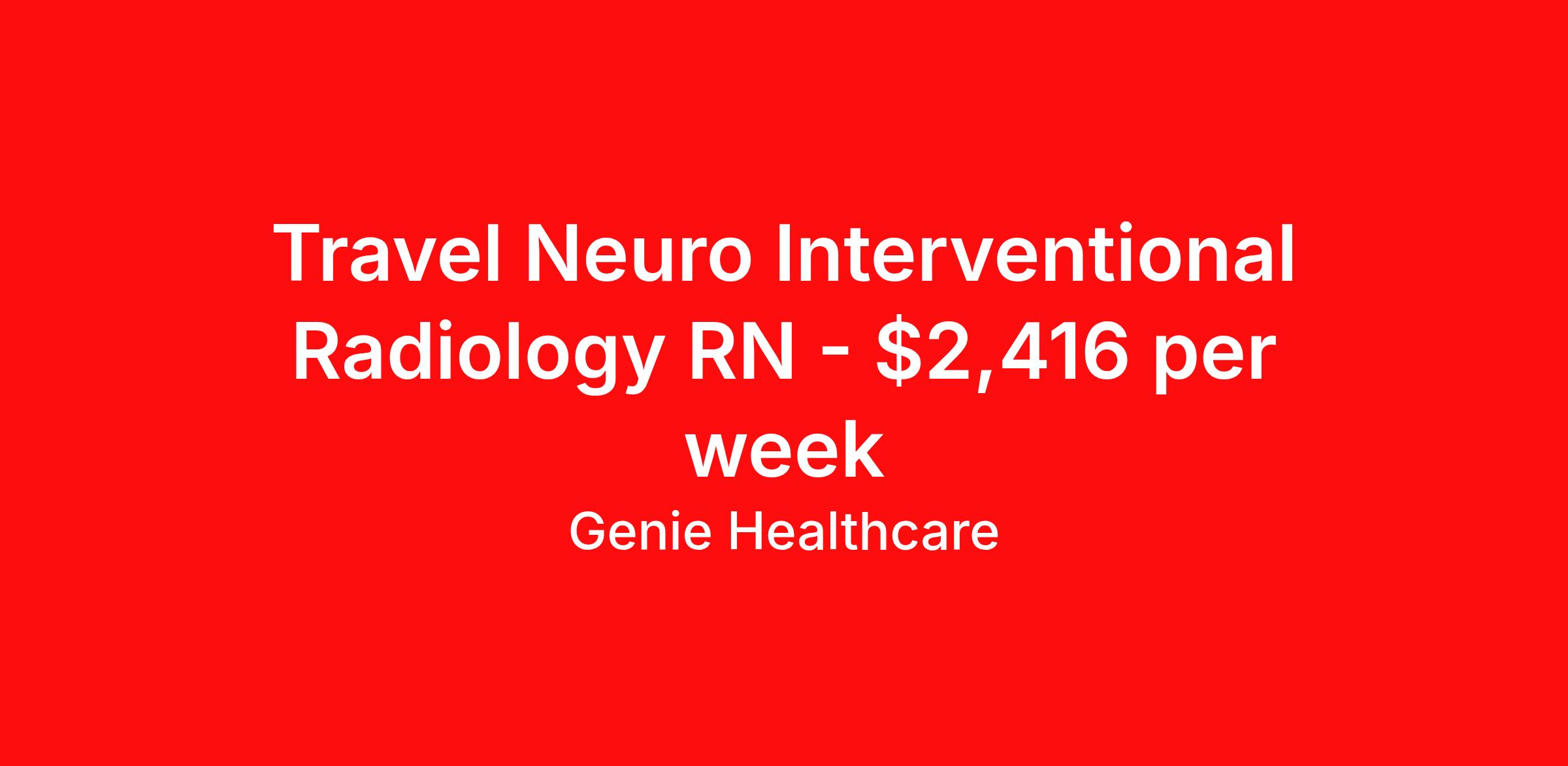 Genie Healthcare is seeking a travel nurse RN Interventional Radiology for a travel nursing job in Corpus Christi, Texas. Job Description & Requirements Specialty: Interventional Radiology Discipline: RN Start Date: 04/13/2026 Duration: 13 weeks 40 hours per week Shift: 8 hours, days Employment Type: Travel Genie Healthcare is looking for a Radiology/Imaging to work in Interventional Radiology Tech for a 13 weeks travel assignment located in Corpus Christi, TX for the Shift (5x8 Days - Please verify shift details with recruiter, 07:00:00-15:00:00, 8.00-5). Pay and benefits packages are estimated based on client bill rate at time the job was posted. These rates are subject to change. Exact pay and benefits vary based on several things, including, but not limited to, guaranteed hours, client changes in bill rate, experience, etc. Benefits: Medical Insurance, Dental Insurance, Vision Insurance, 401(k) with company matching (50% up to 6% of what you contribute) Genie Healthcare Job ID 17748595. Pay package is based on 8 hour shifts and 40.0 hours per week (subject to confirmation) with tax-free stipend amount to be determined. Posted job title: Radiology/Imaging:Interventional Radiology Tech,07:00:00-15:00:00 About Genie Healthcare Genie Healthcare is one of the fastest growing Nurse Travel Agencies in the USA. Genie serves hundreds of facilities and has over 4000 current travel RN contracts open at any given time. Genie provides travel RN’s flexibility, support, top pay scale, housing and the 1 rated, multi-state health insurance coverage. Genie Healthcare carries with it a commitment to providing a comprehensive level of service and quality care. Growing from a small team of eager recruiters to a company with satisfied clients in nearly every corner of the nation, delivering excellence in patient and customer care is the key to Genie’s success. The management team has 20 years of experience in workforce solutions and staffing in medical and non-medical fields, roles ranging from Clerical job to Cardiologist to software developer to CEO.