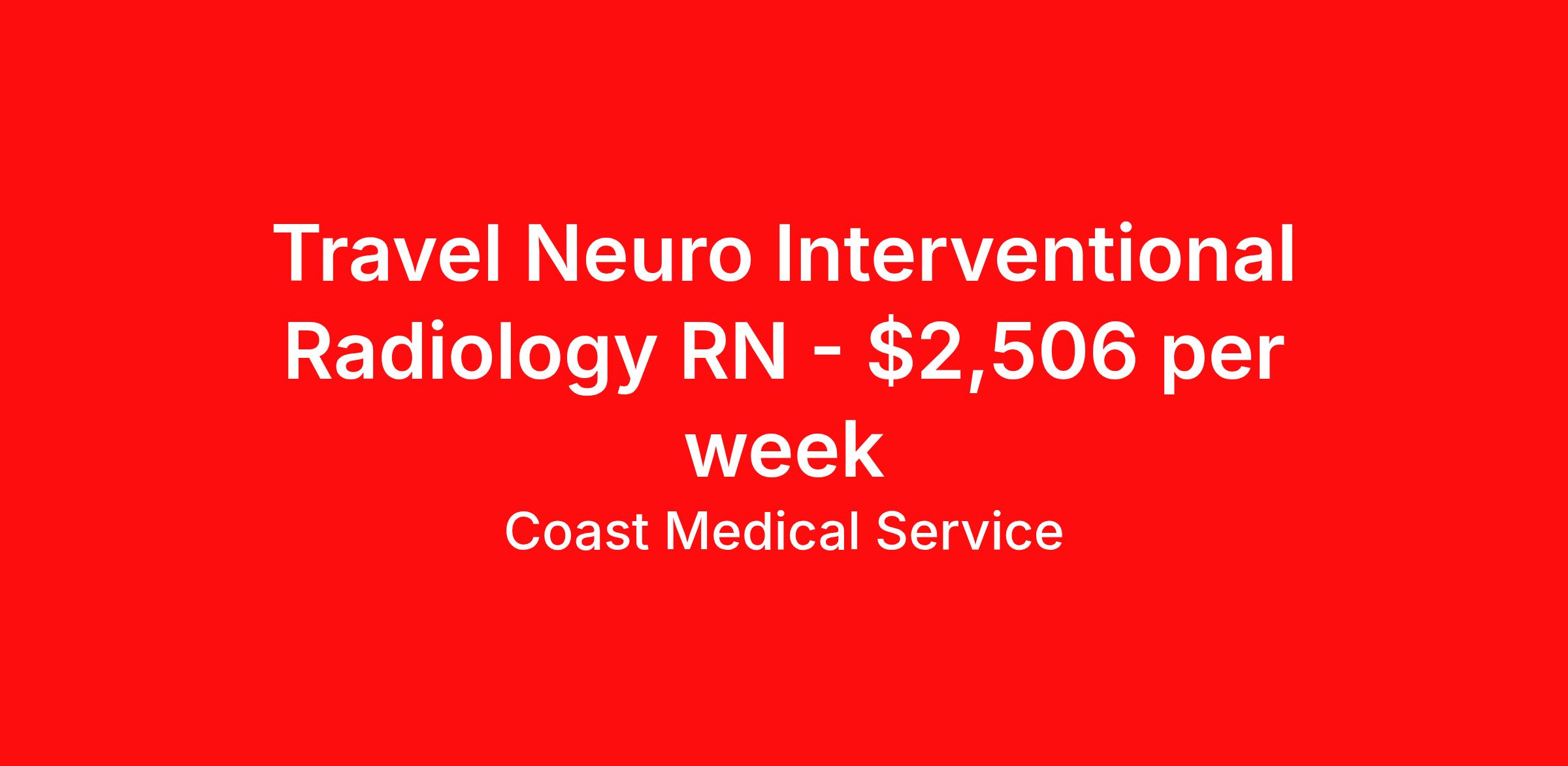 Coast Medical Service is seeking a travel nurse RN Interventional Radiology for a travel nursing job in Corpus Christi, Texas. Job Description & Requirements Specialty: Interventional Radiology Discipline: RN Start Date: ASAP Duration: 13 weeks 40 hours per week Shift: 8 hours, days Employment Type: Travel Coast Medical Service is a nationwide travel nursing & allied healthcare staffing agency dedicated to providing an elite traveler experience for the experienced or first-time traveler. Coast is featured on Blue Pipes' 2023 Best Travel Agencies and named a 2022 Top Rated Healthcare Staffing Firm & 2023 First Half Top Rated Healthcare Staffing Firm by Great Recruiters. Please note that pay rate may differ for locally based candidates. Please apply here or contact a recruiter directly to learn more about this position & the facility, and/or explore others that may be of interest to you. We look forward to speaking with you! Coast Medical Services Job ID 35671606. Pay package is based on 8 hour shifts and 40.0 hours per week (subject to confirmation) with tax-free stipend amount to be determined. Posted job title: Allied:Interventional Radiology,07:00:00-15:30:00