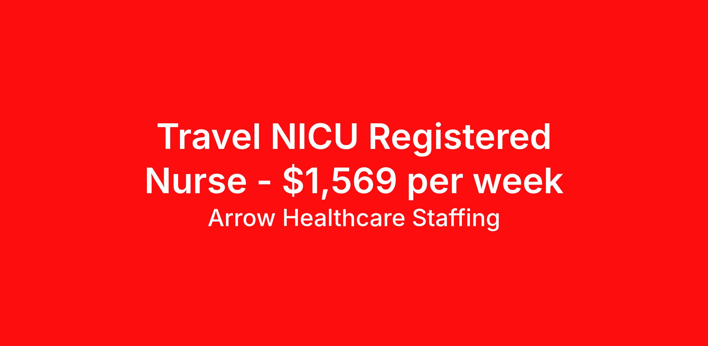 Arrow Healthcare Staffing is seeking a travel nurse RN NICU - Neonatal Intensive Care for a travel nursing job in Canton, Georgia. Job Description & Requirements Specialty: NICU - Neonatal Intensive Care Discipline: RN Start Date: 04/13/2026 Duration: 13 weeks 36 hours per week Shift: 12 hours, days Employment Type: Travel Arrow Healthcare Staffing Job ID 17995277. Pay package is based on 12 hour shifts and 36.0 hours per week (subject to confirmation) with tax-free stipend amount to be determined. Posted job title: RN - NICU RN NICU About Arrow Healthcare Staffing Arrow Healthcare Staffing is a Midwest based travel nursing and allied health recruiting firm. We specialize in local/ travel nursing, medical laboratory, pharmacy, radiology/imaging, therapy, and executive/leadership recruitment. We offer direct hospital contracts and all of the top benefits in the marketplace today. Benefits Medical benefits Vision benefits Weekly pay Benefits start day 1 Holiday Pay 401k retirement plan Dental benefits License and certification reimbursement Guaranteed Hours Continuing Education Cancelation protection Mileage reimbursement Referral bonus