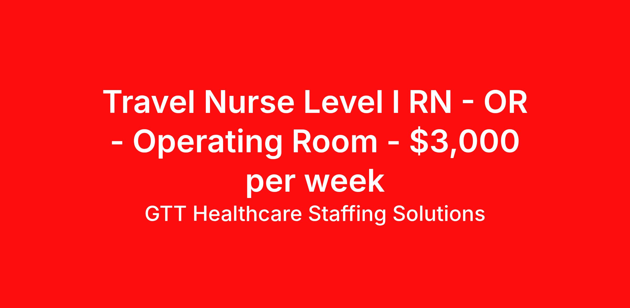 GTT Healthcare Staffing Solutions is seeking a travel nurse RN OR - Operating Room Level I for a travel nursing job in Burlington, Massachusetts. Job Description & Requirements Specialty: OR - Operating Room Discipline: RN Start Date: 04/06/2026 Duration: 13 weeks 36 hours per week Shift: 12 hours, days Employment Type: Travel Description: Registered Nurse – OR Location: Burlington, Massachusetts 01805 Shift & Schedule: 06:30 AM - 07:00 PM 12H Day Requirements: License Requirements: MA RN License Experience Requirements: MUST have level 1 trauma and min of 5 years' experience Weekend Requirement: EOW Can required Required Certs: ACLS, BLS, PALS Details: -Flu required prior to start. 6:30a-7p with call -MUST have level 1 trauma and min of 5 years' experience. Large hospital experience is required. -Experience needs to be in most services, but especially independently able to work on transplant, cardiac and vascular cases. -Epic experience required. - No locals accepted within 50 miles. About GTT Healthcare Staffing Solutions GTT Healthcare is a specialized healthcare staffing division of Global Technical Talent, supporting hospitals and healthcare systems across the United States. We connect travel and permanent nurses and allied health professionals with rewarding opportunities at leading medical facilities in more than 30 states. Our consultants are supported by dedicated healthcare recruiters who advocate for their goals, provide transparent communication, and guide them through every step of the assignment lifecycle. We prioritize flexibility, consistent pay, and access to comprehensive benefits so clinicians can focus on delivering exceptional patient care. Benefits Weekly pay Bereavement Medical benefits Dental benefits Vision benefits 401k retirement plan Referral bonus Sick pay Relocation bonus