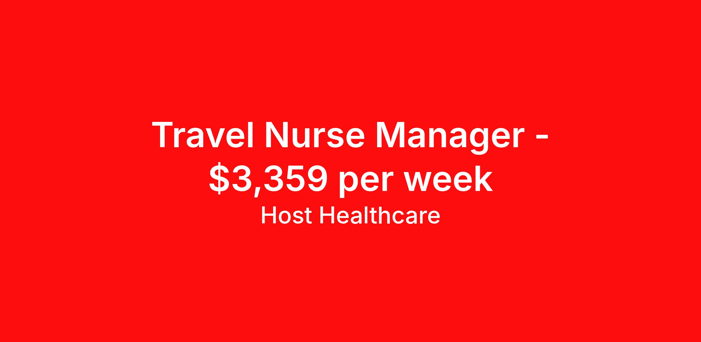 Host Healthcare is seeking a travel nurse RN Manager for a travel nursing job in East Sandwich, Massachusetts. Job Description & Requirements Specialty: Manager Discipline: RN Start Date: 04/20/2026 Duration: 13 weeks 40 hours per week Shift: 8 hours, days Employment Type: Travel Host Healthcare Job ID a1fVX000002xjPlYAI. Pay package is based on 8 hour shifts and 40 hours per week (subject to confirmation) with tax-free stipend amount to be determined. Posted job title: RN - Nurse Manager About Host Healthcare At Host Healthcare, we provide a truly comfortable experience as you explore your travel nursing, therapy, or allied career. We make your travel healthcare journey easy by taking care of all the details, so you don’t have to. We are on a mission to help others live better and we do this by helping the healers of the world be as comfortable as possible. With access to tens of thousands of travel nursing, therapy, and allied jobs in all 50 states, our responsive and friendly recruiters find your dream position based on what’s important to you. During your assignment, get access to premium benefits, including Day 1 medical that continues up to 30 days between assignments, 401K matching, travel reimbursements, dedicated housing support, and more. We also offer 24/7 support from our team and access to our on-staff clinicians so you can feel comfortable and confident throughout your entire assignment. Travel comfortably with Host Healthcare. Benefits Referral bonus School loan reimbursement Vision benefits Wellness and fitness programs Company provided housing options License and certification reimbursement Life insurance Medical benefits Mileage reimbursement Pet insurance Discount program Employee assistance programs Guaranteed Hours Health savings account Holiday Pay 401k retirement plan Continuing Education Dental benefits