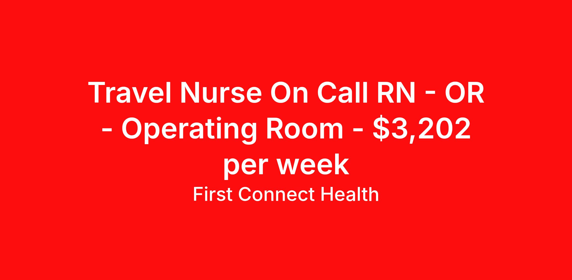 First Connect Health is seeking a travel nurse RN OR - Operating Room for a travel nursing job in Sitka, Alaska. Job Description & Requirements Specialty: OR - Operating Room Discipline: RN Start Date: 04/27/2026 Duration: 13 weeks 40 hours per week Shift: 10 hours, days, evenings, nights, on call Employment Type: Travel Position: Registered Nurse - Operating Room Location: Sitka, AK 99835 ⏰ Shift: Tues-Fri, 10 hour shifts plus call Duration: 13 Weeks Start Date: 04/27/2026 Gross Weekly Pay (40 hrs): $3202 ✅ Requirements: 3 years of Operating Room experience is Required We handle all types of elective and emergency cases performed, including abdominal, thoracic, Urology, ENT, Plastic, Orthopedics, Vascular and OB/GYN. Multi-tasks efficiently and ensures the surgical cases proceed throughout the day in a timely manner. Utilizes after-hour call services, to staff the Operating Rooms (OR), for nights, holidays and weekends. AK License Required Flu vaccine required Current BLS ACLS PALS Experience in Critical Access Hospital and/or Rural Operating Rooms strongly preferred. About First Connect Health At First Connect Health , we take pride in being a Joint Commission–certified healthcare staffing agency , headquartered in Newark, New Jersey. This prestigious certification is more than just a seal — it's a reflection of our commitment to excellence, safety, and quality in everything we do. By meeting the rigorous standards set by The Joint Commission, one of the most respected accrediting bodies in healthcare, we've demonstrated that our processes, compliance, and patient care standards are aligned with the highest levels of quality in the industry. But our dedication goes beyond certifications. Nurses choose First Connect Health because: ✅ Trust and Transparency: We foster honest communication, timely updates, and full transparency throughout your placement journey. ✅ Best Pay & Benefits: We offer industry-leading compensation packages, along with benefits that support your career goals. ✅ Flexibility & Choice: Whether you're seeking short-term assignments, long-term contracts, or local opportunities, we provide the flexibility to suit your preferences. ✅ Personalized Support: Our recruiters take the time to understand your needs, guiding you with care, respect, and responsiveness at every step. When you work with First Connect Health, you're not just another number — you're a valued professional. Join a team that’s focused on your success, your well-being, and your future in healthcare. Benefits Medical benefits Sick pay 401k retirement plan Weekly pay Referral bonus