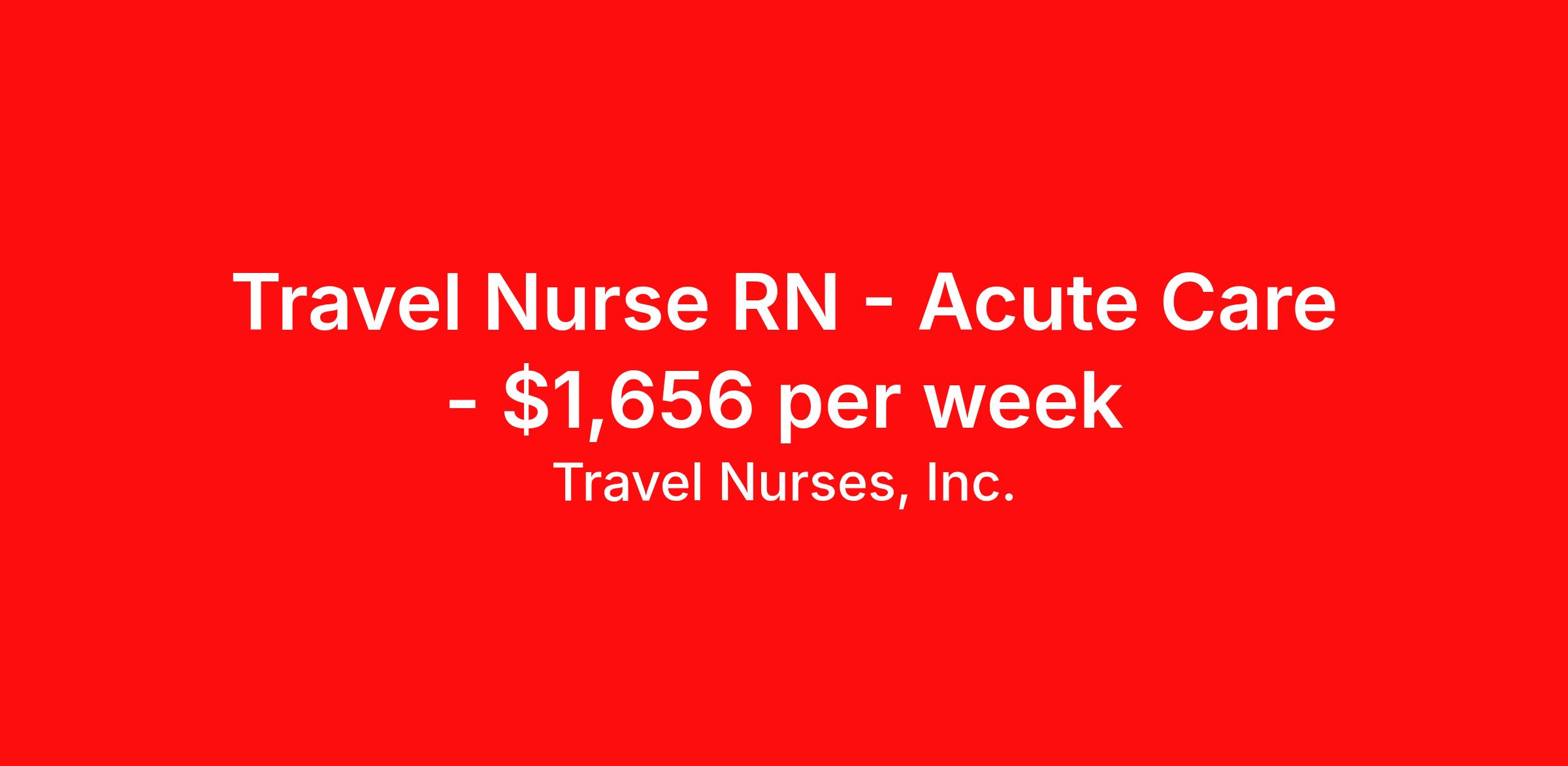 Travel Nurses, Inc. is seeking a travel nurse RN Acute Care for a travel nursing job in Highlands, North Carolina. Job Description & Requirements Specialty: Acute Care Discipline: RN Start Date: ASAP Duration: 13 weeks 36 hours per week Shift: 12 hours Employment Type: Travel Travel Nurses, Inc. Job ID 296171. Pay package is based on 12 hour shifts and 36 hours per week (subject to confirmation) with tax-free stipend amount to be determined. Posted job title: TRAVEL - RN - ACUTE CARE - TELE (610) - 6:45AM - 7:15PM About Travel Nurses, Inc. Travel Nurses, Inc. is a leading healthcare staffing agency that provides healthcare professionals with opportunities to work across the country. Founded by nurses in 1988, TNI has more than 30 years of experience in the industry. The agency initially focused on staffing operating room settings in the MidSouth. However, this quickly evolved to encompass all nursing specialties and allied health fields nationwide. At the heart of our mission is a profound respect for nurses, whom we consider the cornerstone of healthcare. This acknowledgment extends beyond the nursing profession alone. Travel Nurses, Inc. now proudly embraces a wide array of healthcare professionals, recognizing their crucial roles in our collective mission. Travel Nurses, Inc. is dedicated to providing comprehensive support and opportunities that will help facilitate complete career mobility in the healthcare field. Our commitment to transparency ensures that all professionals, not just nurses, can confidently accept any assignment without financial uncertainties. We prioritize our professionals’ well-being with comprehensive benefits packages, including day-one healthcare coverage, competitive salaries, bonuses and incentives. This underscores our unwavering commitment to offering the best possible rewards and support for all the professionals we serve. Benefits Weekly pay Continuing Education 401k retirement plan Wellness and fitness programs Mileage reimbursement Referral bonus Employee assistance programs Medical benefits Dental benefits Vision benefits Benefits start day 1 License and certification reimbursement Life insurance Retention bonus