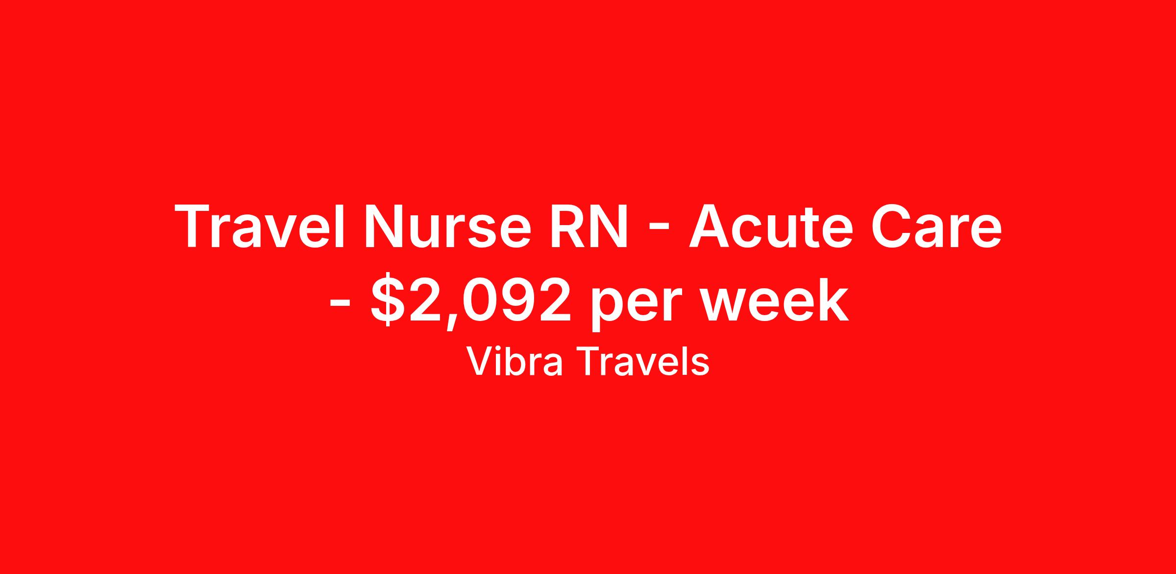 Vibra Travels is seeking a travel nurse RN Acute Care for a travel nursing job in Anderson, South Carolina. Job Description & Requirements Specialty: Acute Care Discipline: RN Duration: 13 weeks 36 hours per week Shift: 12 hours, nights Employment Type: Travel VIBRA TRAVELS is looking for a CORPORATE TRAVEL REGISTERED NURSE to join our team. We look for nurses with acute care experience in ICU, step down, med surg/tele, and acute rehab. Benefits/Perks of working with VIBRA TRAVELS: • Work with 1 recruiter from start to finish and assignment to assignment • Local and Non-local positions available • Competitive hourly rate in addition to tax-free stipend (if applicable) • No pay cuts mid-contract • Referral bonus (up to $1000 per referral!) • License reimbursement if traveling to new state where new license is required • Your pick of assignments at facilities we own and operate nationwide (70) or partner facilities Qualifications/Skills: • Current BLS certification from a Vibra-approved vendor required. • Additional certifications may be required by Vibra Travels (ex ACLS, PALS, NRP) • 1 full year of RN experience; Diploma or Associate of Science Degree in Nursing required. Current, valid, and active license to practice as a Registered Nurse in the state of employment required. Additional Qualifications/Skills: • Previous acute care experience is strongly preferred. • Ability to project a professional image. • Knowledge of regulatory standards and compliance requirements. • Strong organizational, prioritizing and analytical skills. • Ability to make independent decisions when circumstances warrant. • Working knowledge of computer and software applications used in job functions. • Freedom from illegal use of and effects of use of drugs and alcohol in the workplace As an employee of Vibra Travels, you will be eligible to enroll in Medical and Prescription benefits once you meet the eligibility requirements outlined by the Affordable Care Act (ACA) Vibra Travels Job ID 20260213-35. Pay package is based on 12 hour shifts and 36 hours per week (subject to confirmation) with tax-free stipend amount to be determined. About Vibra Travels Regardless of the placement you’re seeking, you’ll experience the same great benefits when choosing Vibra Travels for your next contract. White-glove service, every step of the way: At Vibra Travels, we believe in providing top-notch service to our travel nurses. From the moment you first contact us, you’ll experience a level of support and care that sets us apart from the rest. Your recruiter, your partner: Unlike other travel nursing agencies, we believe in building one-on-one relationships with our clinicians. Your dedicated recruiter will be your advocate, guiding you through the entire process and ensuring your needs are met. Clinical support at your fingertips: We understand that being a traveler can sometimes be challenging. That’s why we have a dedicated clinical support team available to answer any questions or concerns you may have during your assignments. Nationwide placements, endless opportunities: With Vibra Travels, you’ll have access to placements across the nation. Whether you’re looking for an acute care, rehabilitation, critical care, or behavioral health hospital, we have opportunities waiting for you in every corner of the country. Join us today and experience traveling done different! Benefits Holiday Pay License and certification reimbursement Medical benefits Referral bonus
