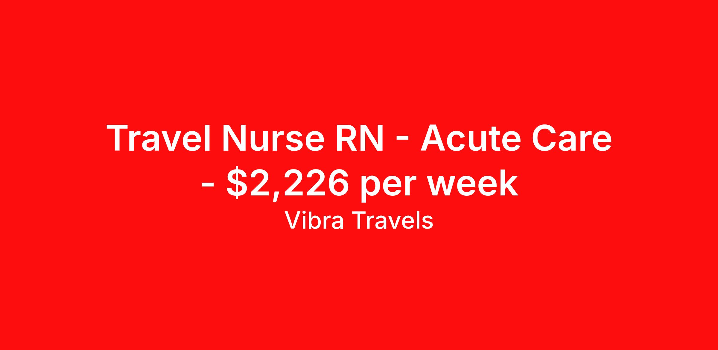 Vibra Travels is seeking a travel nurse RN Acute Care for a travel nursing job in Rochelle Park, New Jersey. Job Description & Requirements Specialty: Acute Care Discipline: RN Duration: 13 weeks 36 hours per week Shift: 12 hours, nights Employment Type: Travel VIBRA TRAVELS is looking for a CORPORATE TRAVEL RESPIRATORY THERAPIST to join our team. We look for nurses with acute care experience in ICU, step down, med surg/tele, and acute rehab. Benefits/Perks of working with VIBRA TRAVELS: • Work with 1 recruiter from start to finish and assignment to assignment • Local and Non-local positions available • Competitive hourly rate in addition to tax-free stipend (if applicable) • No pay cuts mid-contract • Referral bonus (up to $1000 per referral!) • License reimbursement if traveling to new state where new license is required • Your pick of assignments at facilities we own and operate nationwide (70) or partner facilities Qualifications/Skills: • Current BLS certification from a Vibra-approved vendor required. • Additional certifications may be required by Vibra Travels (ex ACLS, PALS, NRP) • 1 full year of RN experience; Diploma or Associate of Science Degree in Nursing required. Current, valid, and active license to practice as a Registered Nurse in the state of employment required. Additional Qualifications/Skills: • Previous acute care experience is strongly preferred. • Ability to project a professional image. • Knowledge of regulatory standards and compliance requirements. • Strong organizational, prioritizing and analytical skills. • Ability to make independent decisions when circumstances warrant. • Working knowledge of computer and software applications used in job functions. • Freedom from illegal use of and effects of use of drugs and alcohol in the workplace As an employee of Vibra Travels, you will be eligible to enroll in Medical and Prescription benefits once you meet the eligibility requirements outlined by the Affordable Care Act (ACA) Vibra Travels Job ID 20260126-21. Pay package is based on 12 hour shifts and 36 hours per week (subject to confirmation) with tax-free stipend amount to be determined. About Vibra Travels Regardless of the placement you’re seeking, you’ll experience the same great benefits when choosing Vibra Travels for your next contract. White-glove service, every step of the way: At Vibra Travels, we believe in providing top-notch service to our travel nurses. From the moment you first contact us, you’ll experience a level of support and care that sets us apart from the rest. Your recruiter, your partner: Unlike other travel nursing agencies, we believe in building one-on-one relationships with our clinicians. Your dedicated recruiter will be your advocate, guiding you through the entire process and ensuring your needs are met. Clinical support at your fingertips: We understand that being a traveler can sometimes be challenging. That’s why we have a dedicated clinical support team available to answer any questions or concerns you may have during your assignments. Nationwide placements, endless opportunities: With Vibra Travels, you’ll have access to placements across the nation. Whether you’re looking for an acute care, rehabilitation, critical care, or behavioral health hospital, we have opportunities waiting for you in every corner of the country. Join us today and experience traveling done different! Benefits Holiday Pay License and certification reimbursement Medical benefits Referral bonus