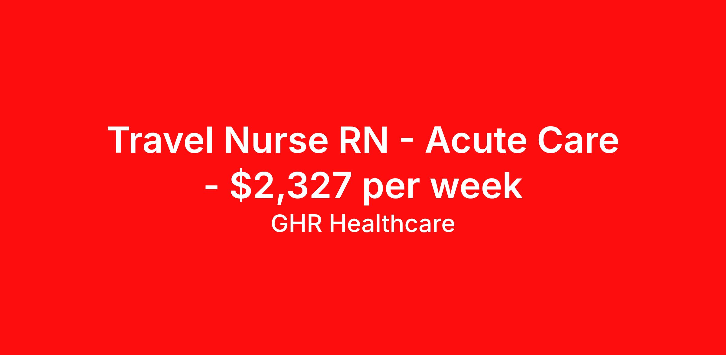 GHR Healthcare is seeking a travel nurse RN Acute Care for a travel nursing job in Cartersville, Georgia. Job Description & Requirements Specialty: Acute Care Discipline: RN Start Date: ASAP Duration: 12 weeks 40 hours per week Shift: 8 hours Employment Type: Travel GHR Healthcare Job ID 76124760. Pay package is based on 8 hour shifts and 40 hours per week (subject to confirmation) with tax-free stipend amount to be determined. About GHR Healthcare For over 30 years, GHR Healthcare has been the bridge between healthcare professionals and the facilities that need them nationwide. We're committed to uncovering your ideal fit, supported by GHR's dedication to competitive compensation, transparent communication, and a devoted team that genuinely cares about your career journey. You can trust us to stand by your side as your advocate, confidante, and partner in advancing your career. At GHR, care and consideration are at the heart of everything we do. Visit ghrhealthcare.com to learn more.