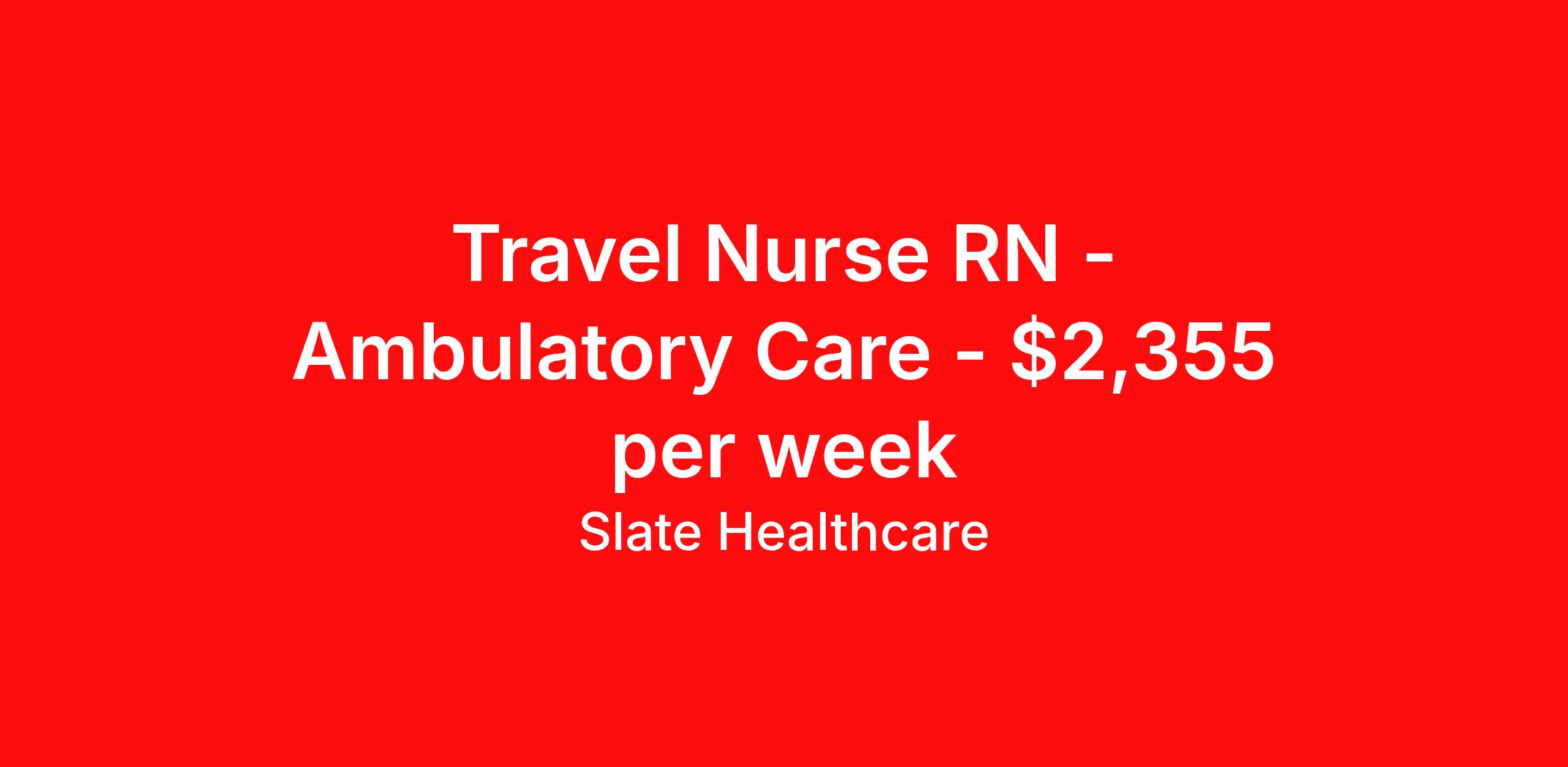 Slate Healthcare is seeking a travel nurse RN Ambulatory Care for a travel nursing job in Glenwood Springs, Colorado. Job Description & Requirements Specialty: Ambulatory Care Discipline: RN Start Date: 03/31/2026 Duration: 13 weeks 38 hours per week Shift: 8 hours, days Employment Type: Travel Profession:RN, JobSpecialty:Clinic / Ambulatory, Shift:Days, Duration:13 weeks Slate Healthcare Job ID e00683ee-ca60-4327-b05b-d8c8db6a6b1f. Pay package is based on 8 hour shifts and 38 hours per week (subject to confirmation) with tax-free stipend amount to be determined. About Slate Healthcare Slate Healthcare is a premier travel healthcare staffing agency, connecting healthcare professionals with thousands of opportunities at top-tier hospitals and facilities across the country. We’re committed to supporting nurses and allied health professionals in building stable, fulfilling careers—while embracing the freedom and excitement that comes with travel. Our goal is simple: to offer flexibility, competitive pay, and personalized placements that align with each clinician’s lifestyle and career goals. At Slate, we empower our professionals to choose when and where they work, while ensuring they receive the highest compensation possible—because we believe that exceptional care starts with empowered caregivers.